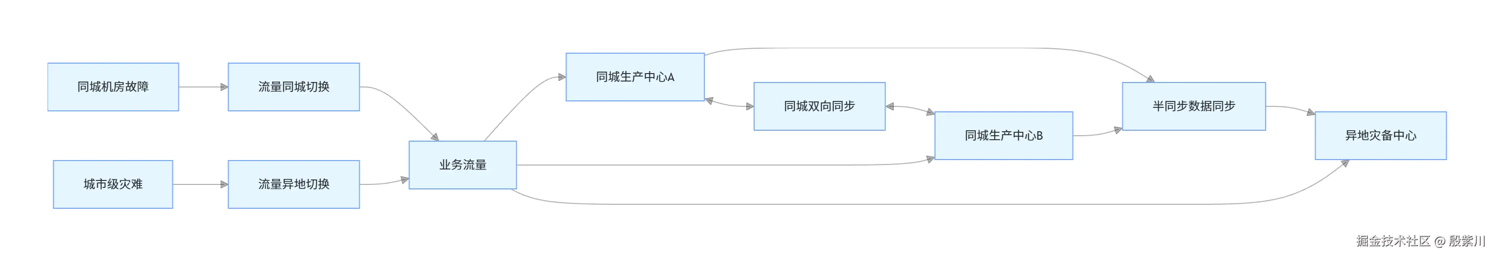 “两地”指两个地理隔离的城市(生产城市+异地灾备城市),“三中心”指生产城市的同城双活两个数据中心,加上异地城市的灾备数据中心。同城双活应对机房级故障,异地灾备中心应对地震、洪水等城市级灾难,数据从同城双活集群同步到异地灾备中心。