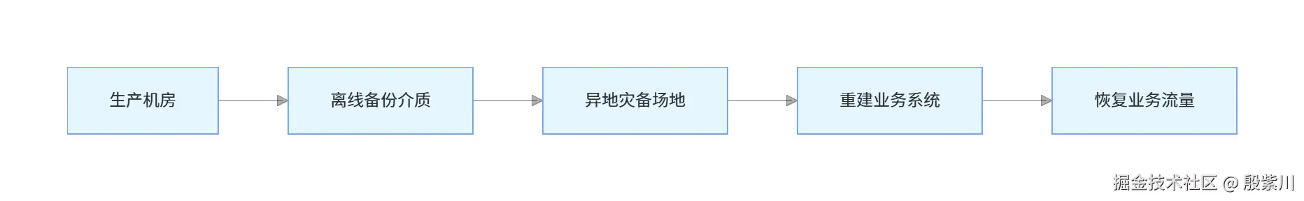 定期将生产数据备份到离线介质(磁带、移动硬盘、对象存储归档存储),备份介质异地存放;灾难发生后,在备用场地重建硬件、系统、应用,恢复备份数据,重启业务。