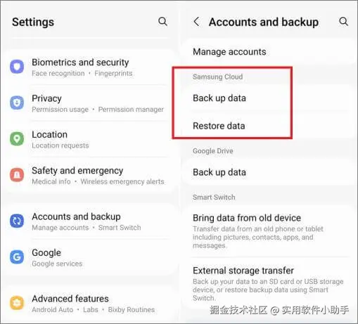 一些 Android 设备制造商提供自己的备份选项,例如适用于三星设备的三星云。在您的 Galaxy 设备上,打开 “设置”>“帐户和备份”。在三星帐户或三星云部分下,您将看到 “备份数据” 和 “恢复数据” 选项。根据您的需要选择一项来执行三星备份和恢复。