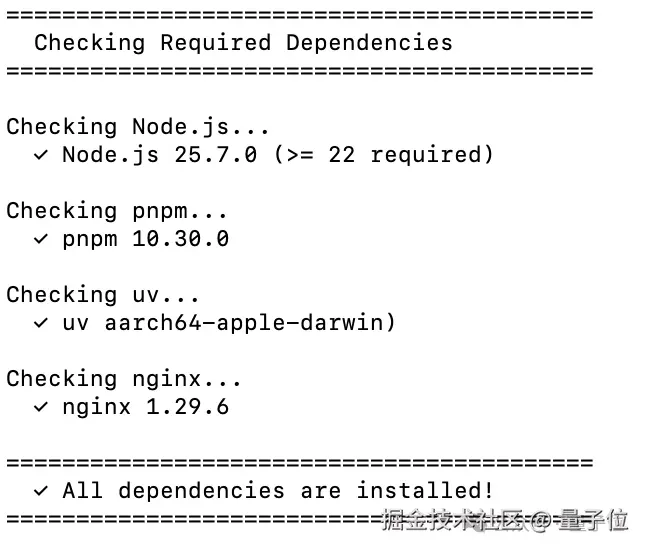 满足前置环境后检查依赖,打开终端进入 deer-flow 根目录,输入: