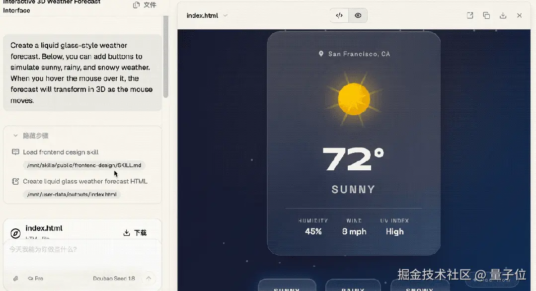 一句话生成液态玻璃天气界面,鼠标悬停还能 3D 形变。