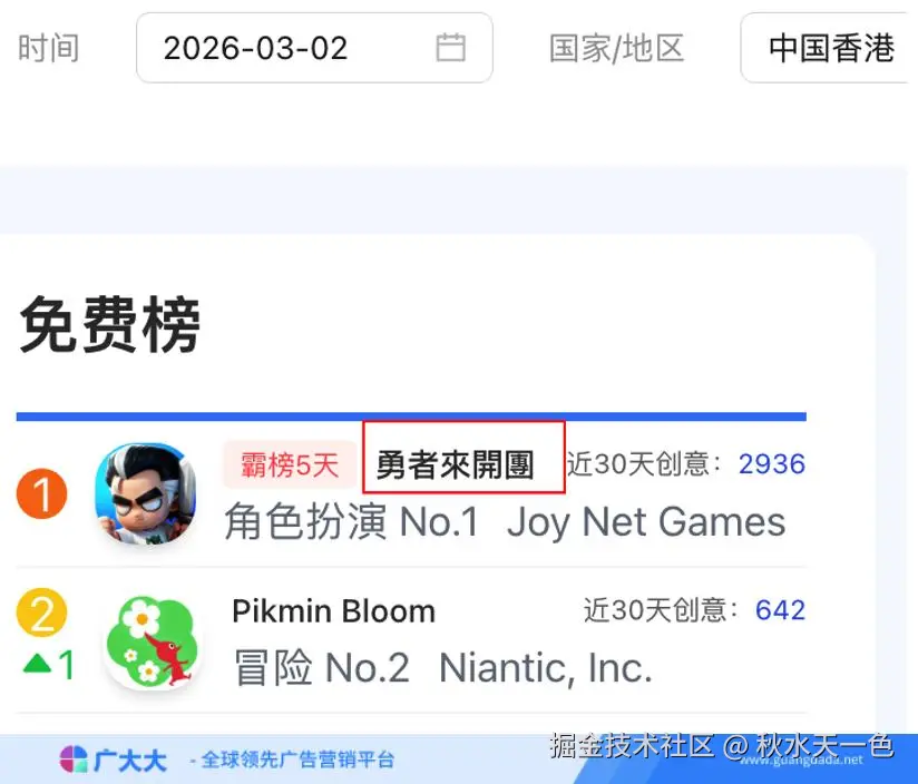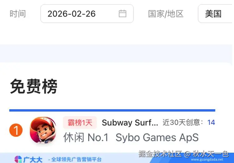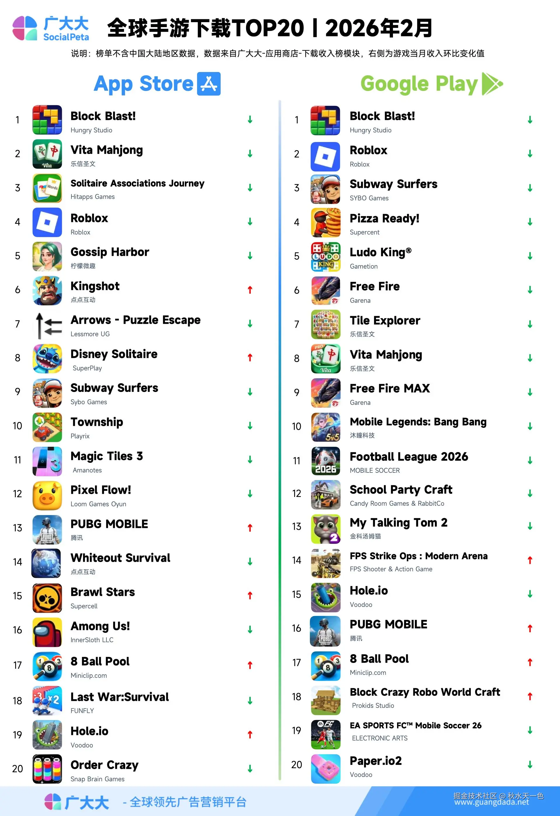 根据广大大——广告主分析等模块数据,广大大数据研究院整理并发布2026年2月全球手游投放、收入和下载TOP20榜单,帮助更多移动应用从业人员了解全球移动市场变化趋势。