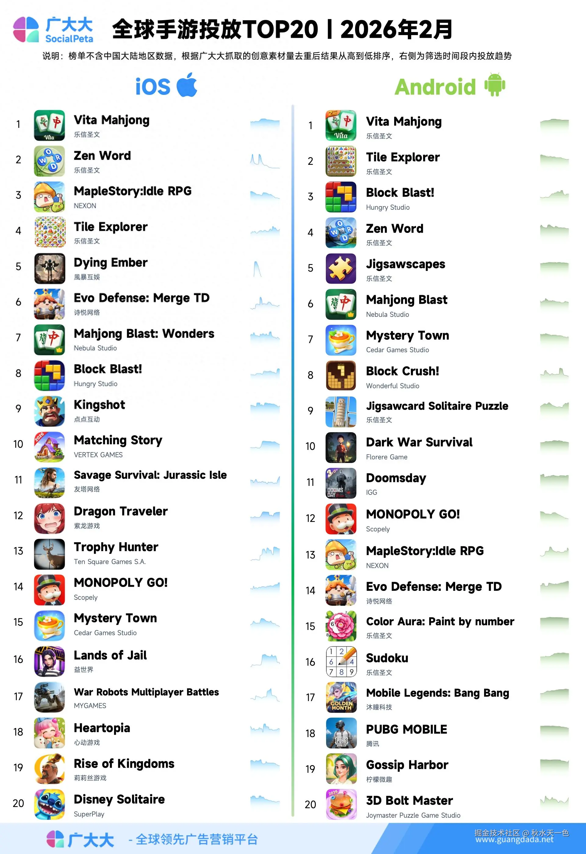 2026年2月全球手游投放TOP20榜单