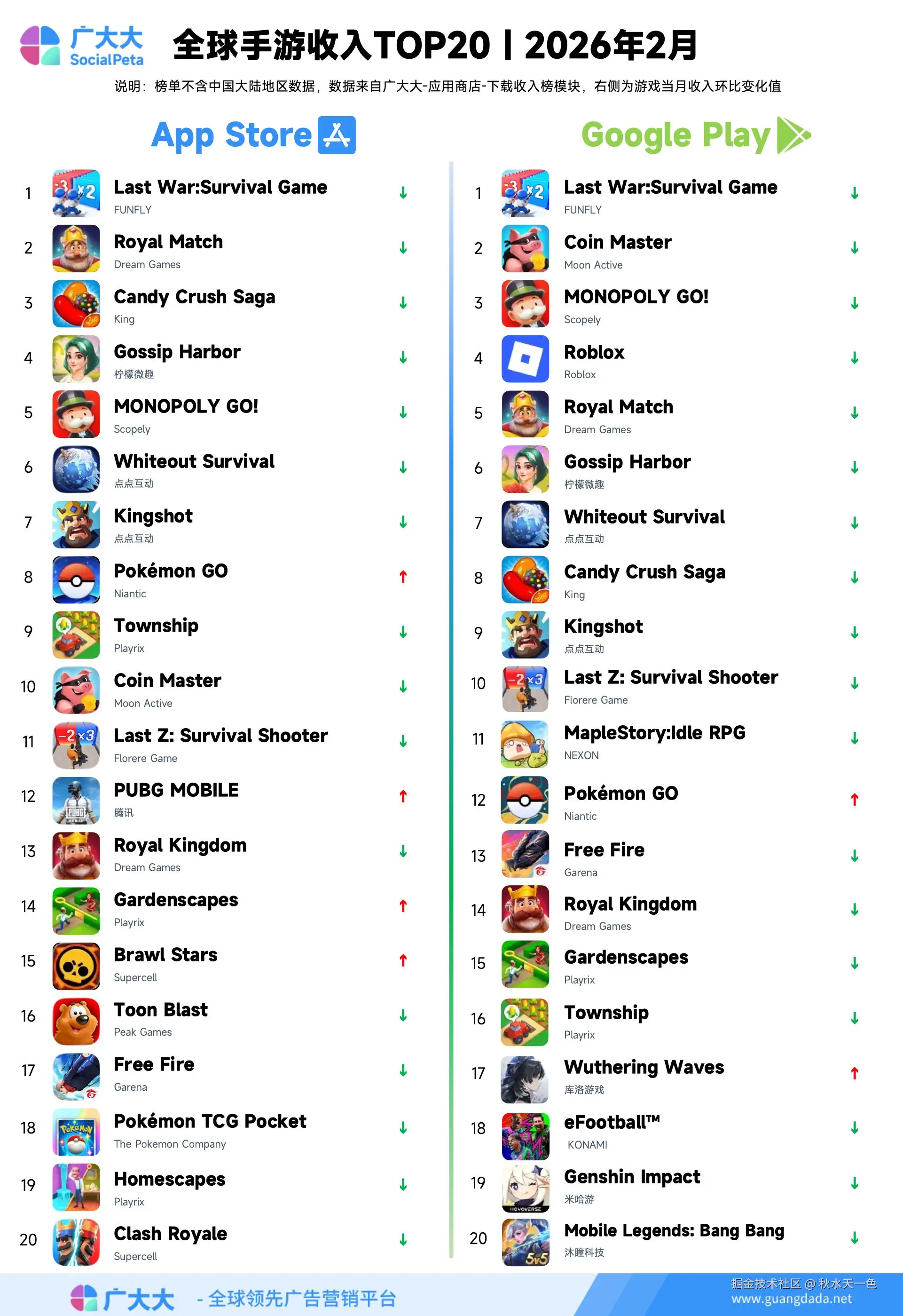 2026年2月全球手游收入TOP20榜单