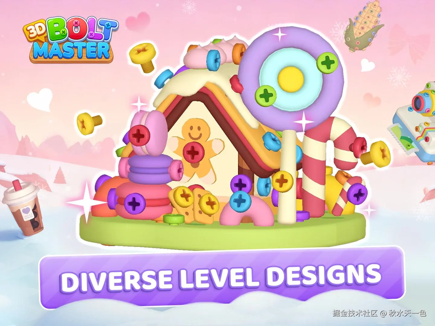 【3D Bolt Master™: Screw Master®】是一款标准的3D拧螺丝三消手游,重力影响、体积碰撞和萌宠点缀让【3D Bolt Master™】的耐玩性和游戏难度更上一个台阶。美术方面也是惯用的鲜艳色调,搭配可爱、治愈元素的家具、玩偶和节日道具,如拐杖糖、姜饼小人、奶茶和马卡龙等。