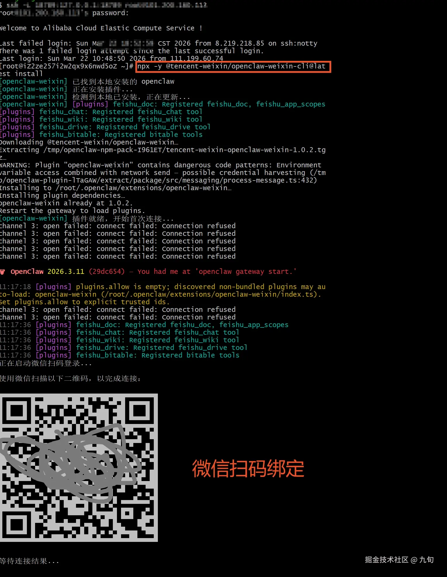 输入完安装命令后,等待2分钟左右,会显示安装成功并显示二维码: