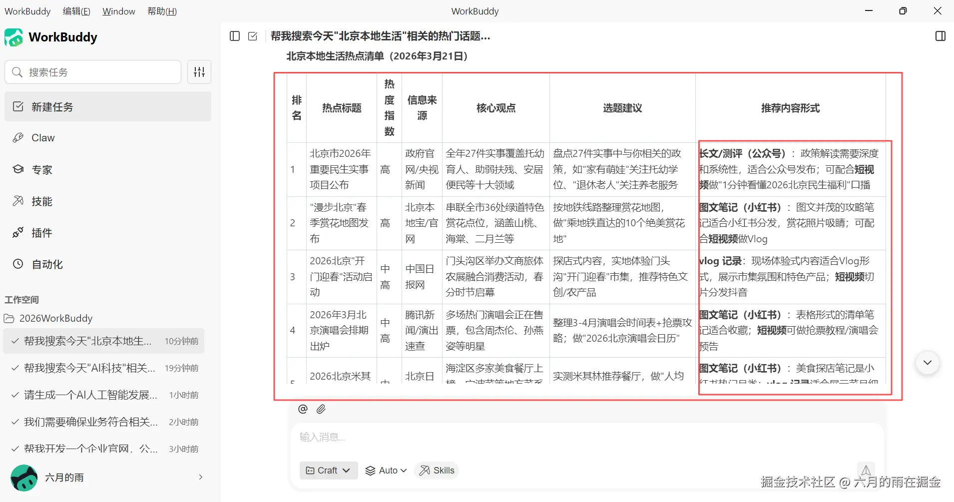 这时我们会看到WorkBuddy 会自动搜索整理互联网上关于 北京本地生活 的信息输出下面格式的结果