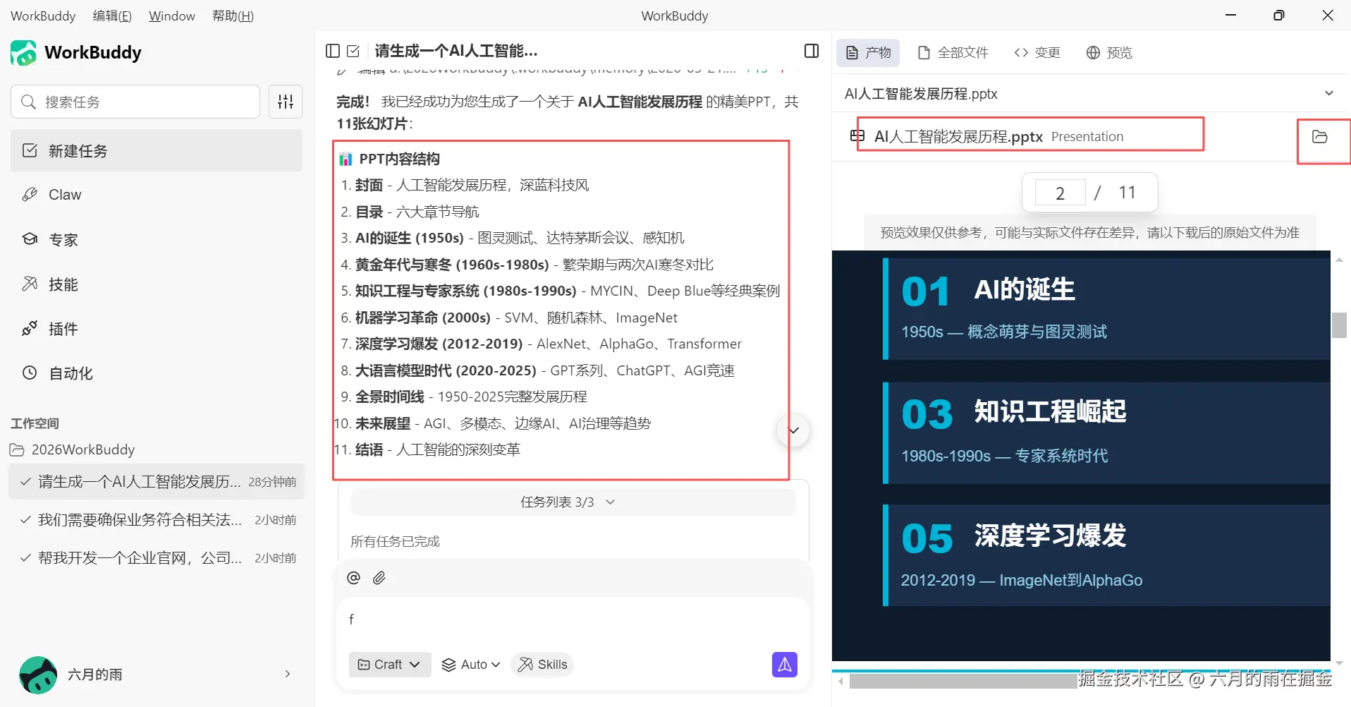 点击【发送】后等待WorkBuddy 为我们生成我们想要的PPT 就可以了。等待我们想要的PPT 生成完成后,我们可以看到如下内容,在WorkBuddy 右侧展示的是实际的PPT