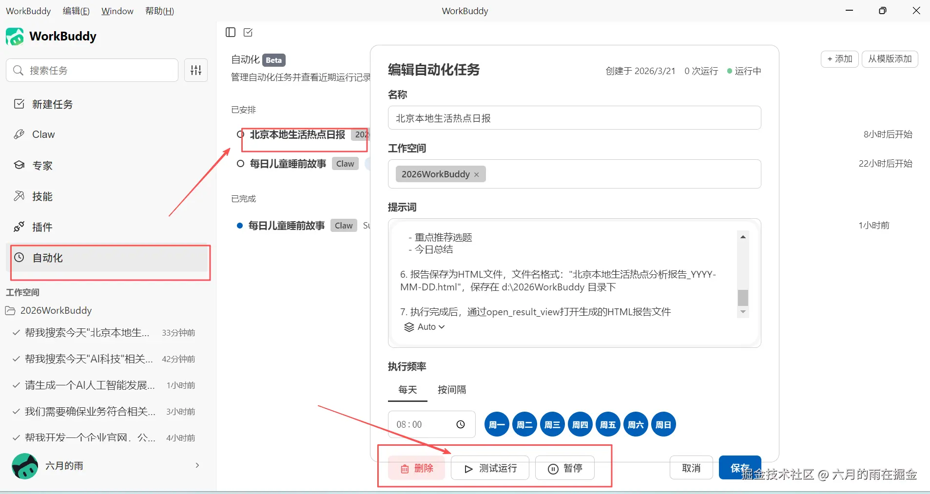 定时任务设置好之后,每天你打开 WorkBuddy 后,定时任务会自动运行。你不需要手动触发,打开软件它就会自动执行到期的任务。这里我们也可以手动测试一下我们的定时任务。找到我们的自动化定时任务,点击后可以看到【测试运行】操作按钮