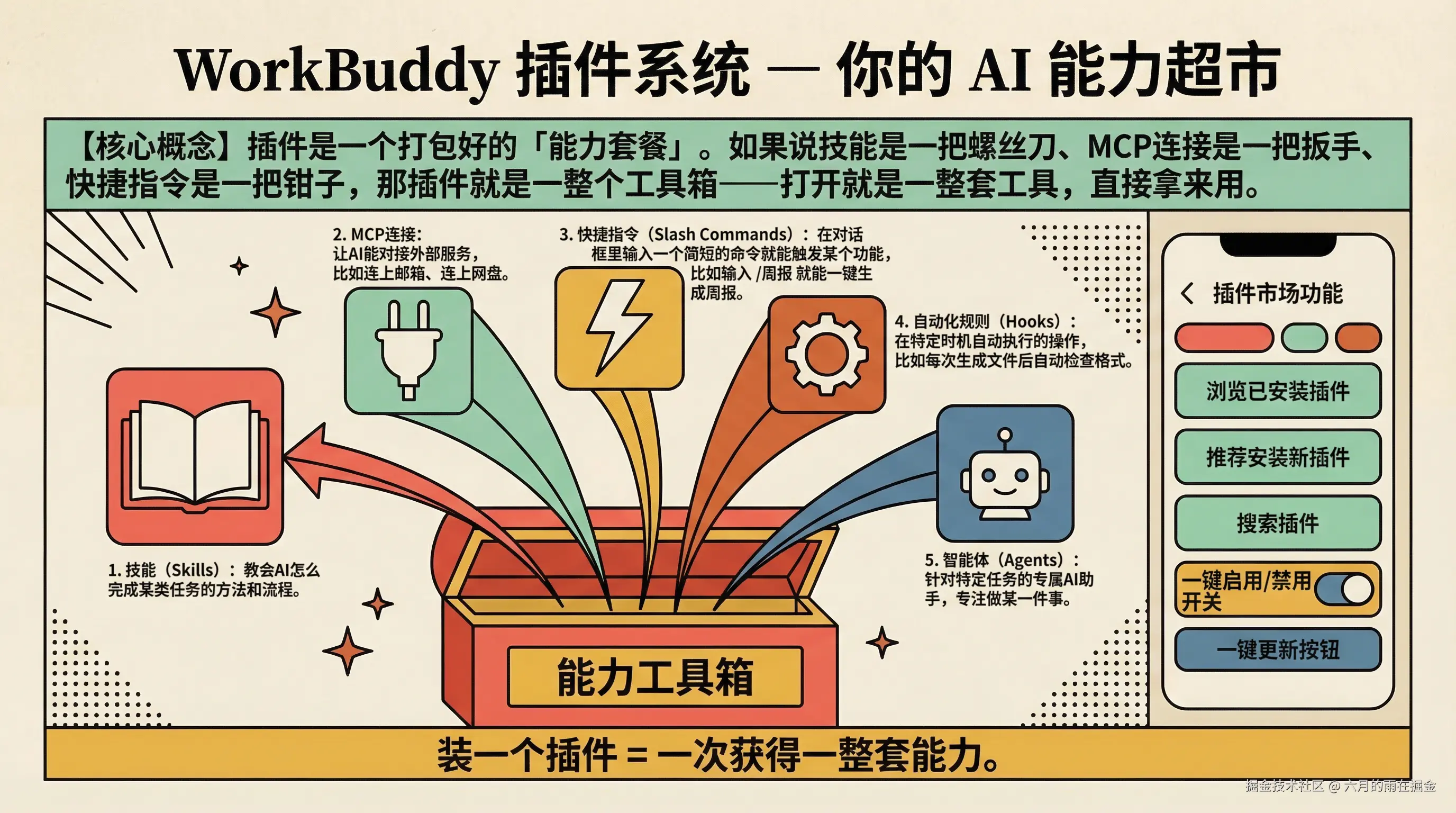 技能我们可以理解为单一的功能,那么插件我们就可以理解为单一功能的复合体,一整套功能。官方的图片可以很明白的看出来