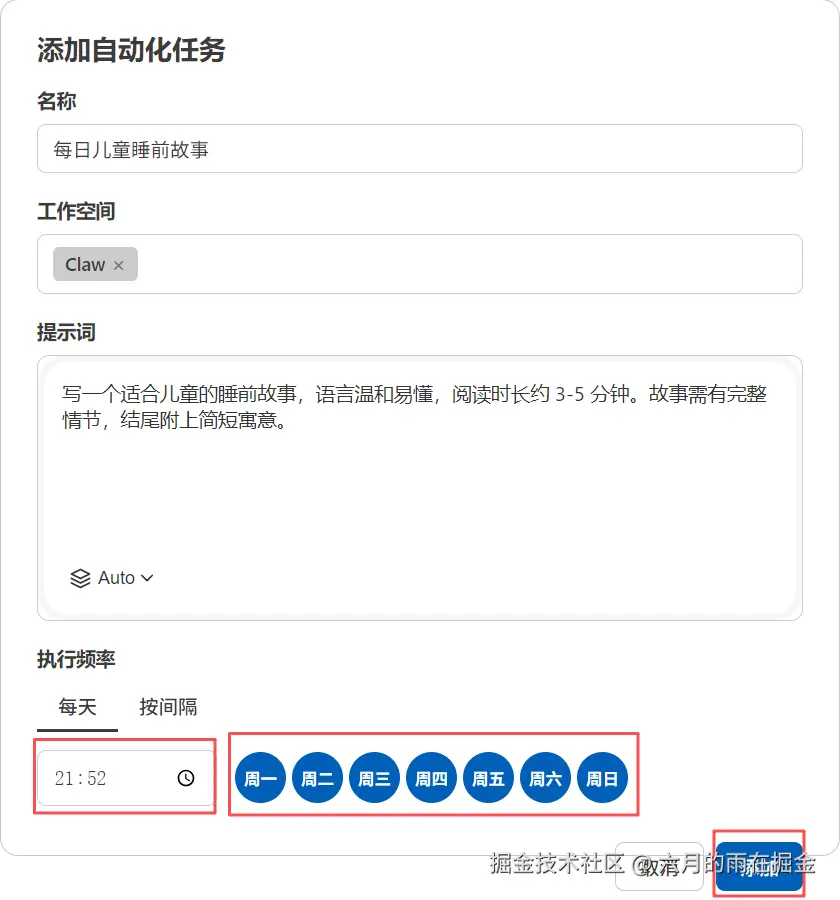 选择【每日儿童睡前故事】然后再打开的添加自动化任务页面选择具体执行频率,时间点,每周的哪天执行,点击【添加】