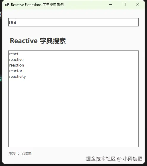 这是 Rx.NET 最经典的应用场景。目标是实现一个字典搜索功能:用户输入时实时查询,但需避免频繁请求,并在有新输入时取消旧请求。