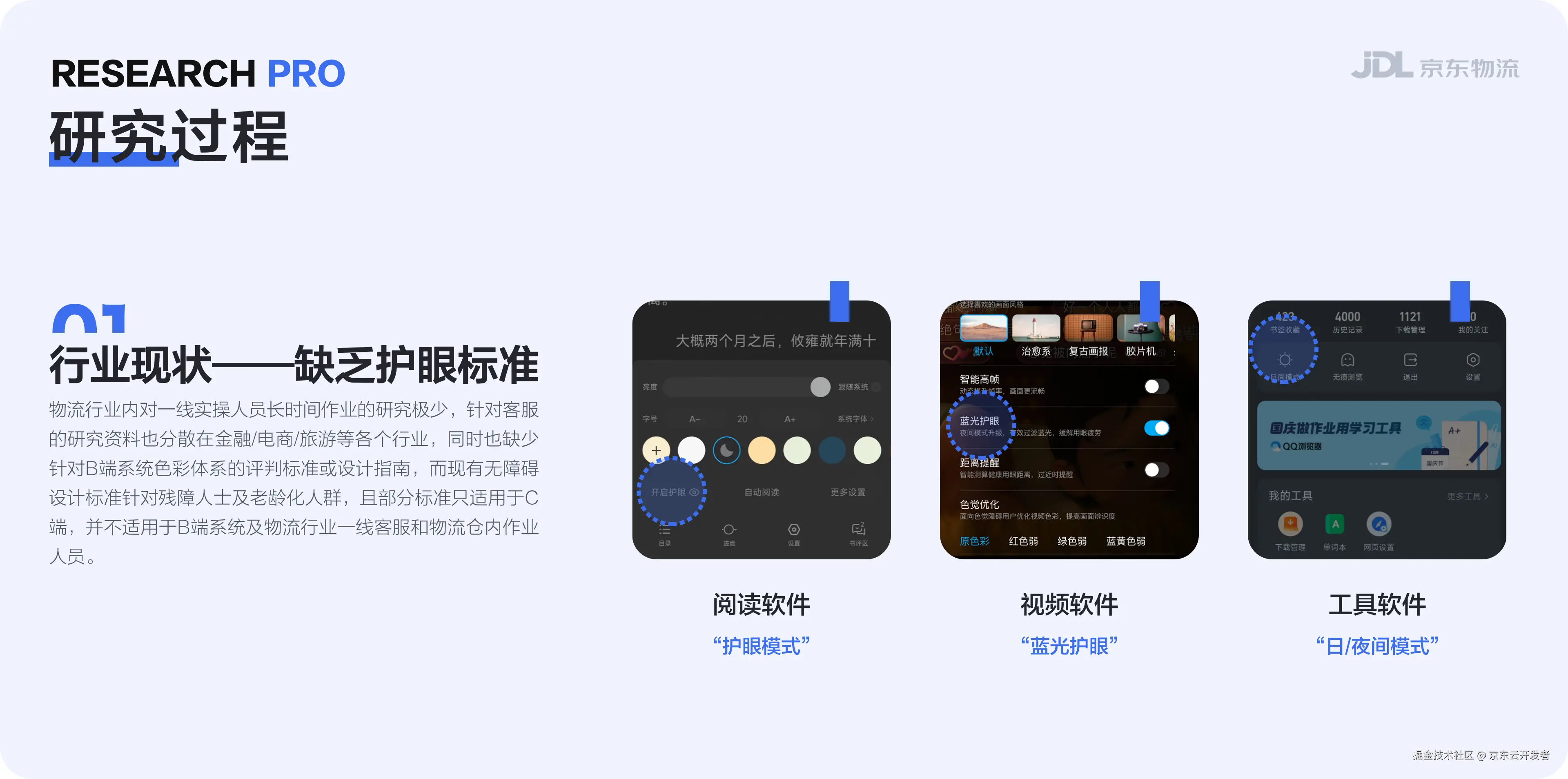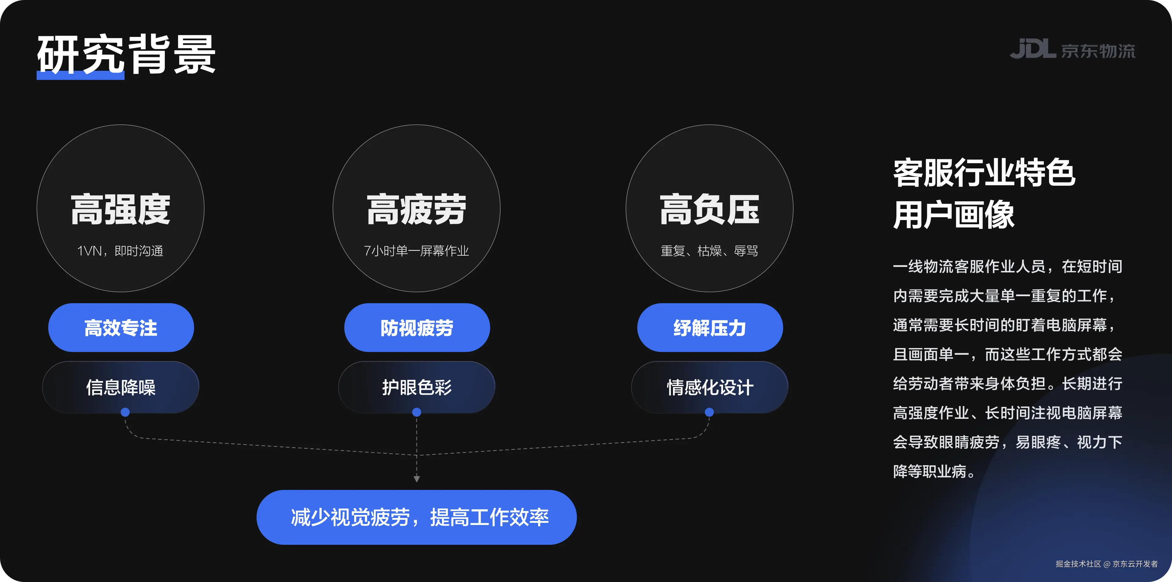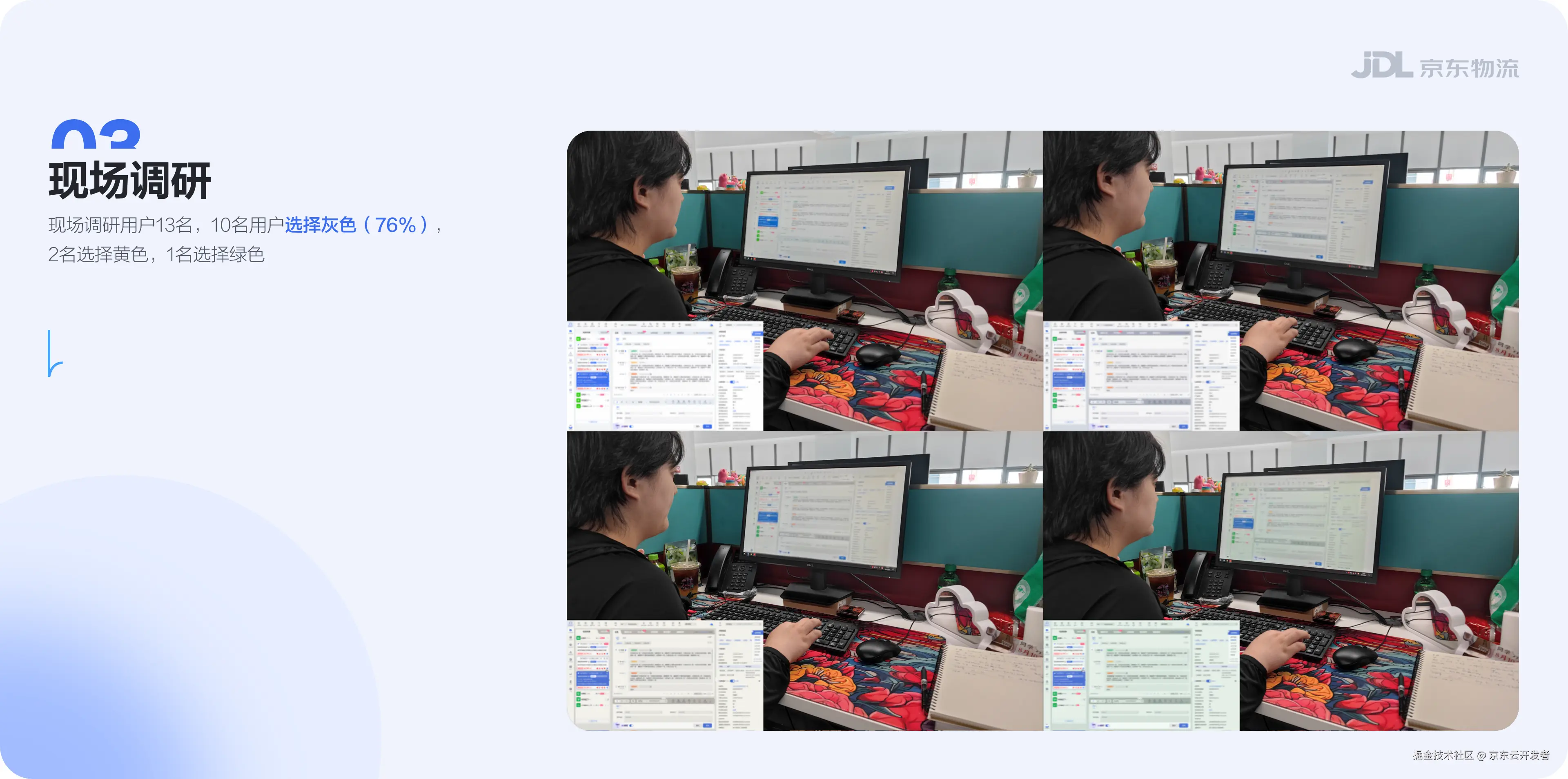聚焦客服工作台,研究在白天室内作业及夜晚室内作业下,界面颜色、环境光线、使用时间对视觉舒适度的影响,设计一套针对物流作业场景下的B端护眼模式,提升一线用户的使用效率及视觉舒适度。