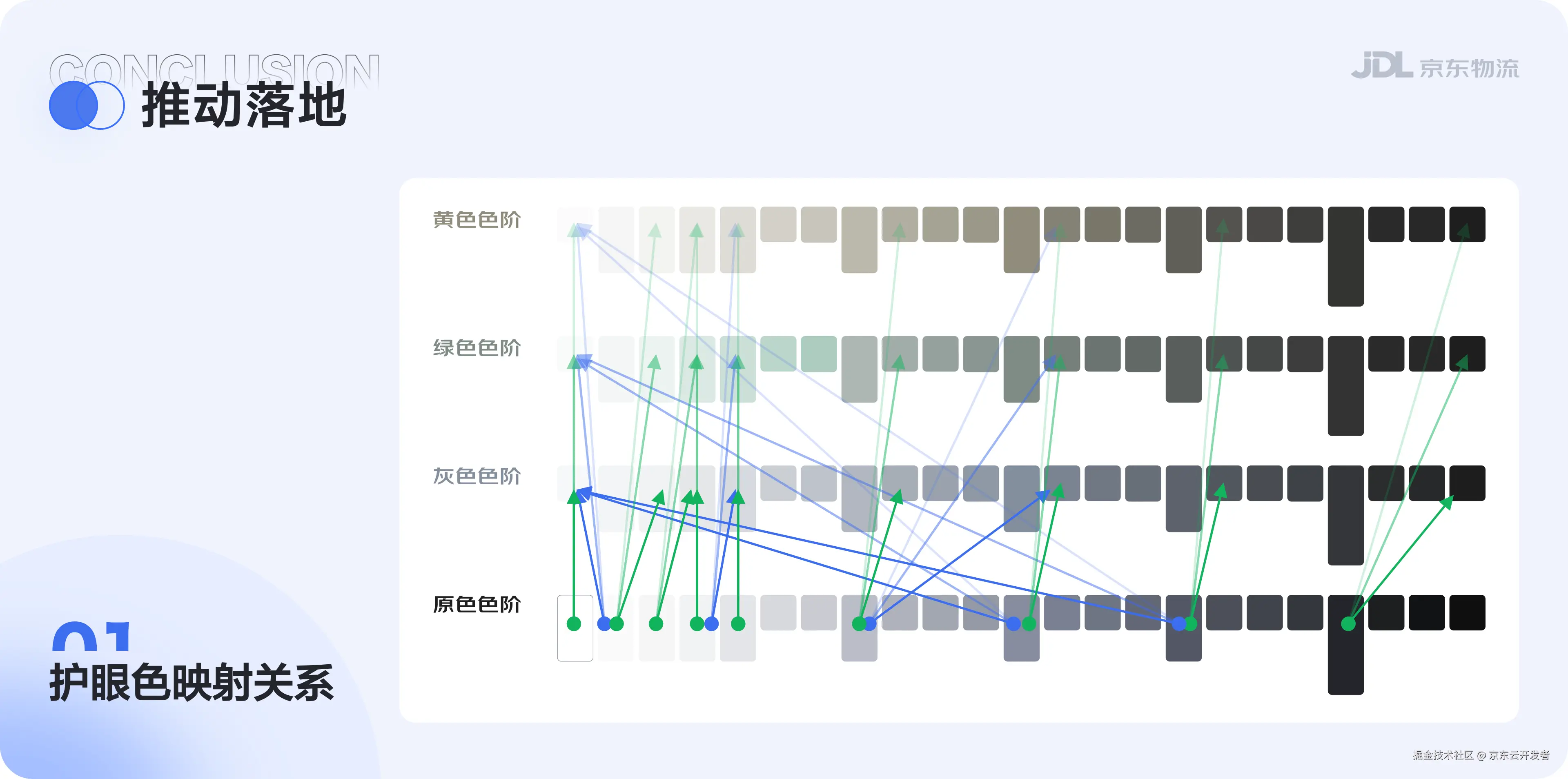 梳理线上颜色使用不规范问题,最终整合需改造颜色29个进行编码化,并对编码进行定义、使用描述、对应原色值与护颜色值,并支持拓展其他护眼色系。