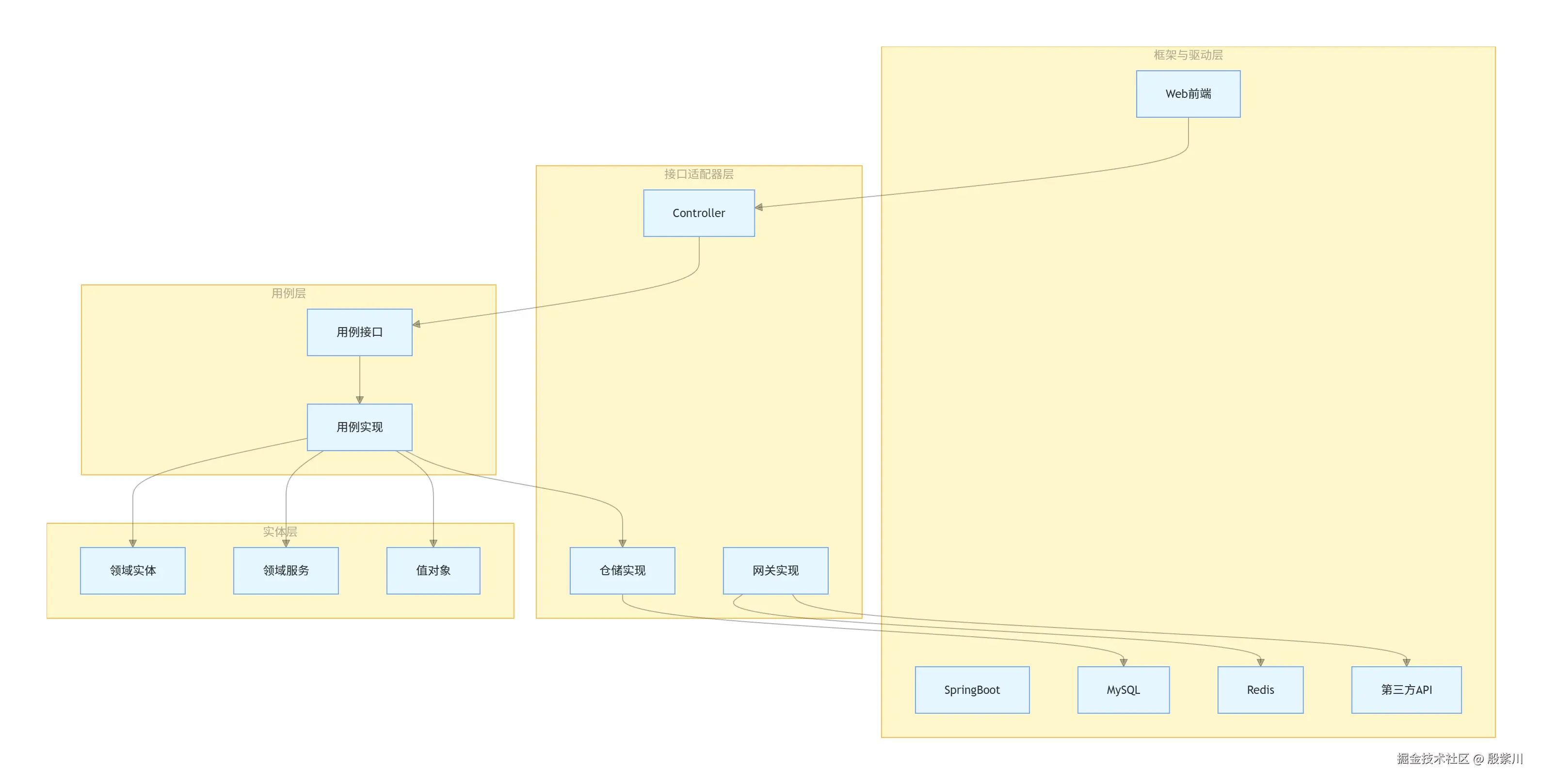 架构设计的本质,是解决业务复杂度带来的代码耦合、迭代困难、维护成本高的问题。分层、六边形、整洁架构三者并非对立,而是一脉相承的演进关系,核心都围绕「关注点分离」与「依赖反转」这两个最本质的设计原则。