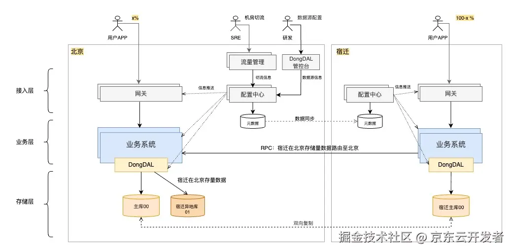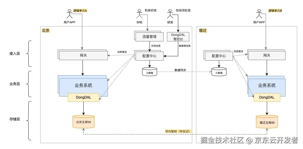 京东数据中心架构是北京和宿迁多机房多活,如下图所示,京东以用户为维度拆分出多个逻辑单元,将逻辑单元分布到北京和宿迁不同机房中。在各机房内流量完全收敛以避免网络延迟,机房间按逻辑单元切流,随着机房间的切流,一个逻辑单元可能落在北京机房也可能落在宿迁机房。