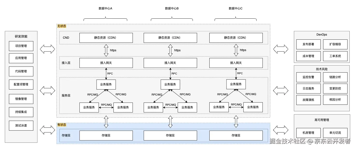 •前端层:通常使用内容分发网络(CDN)或者边缘缓存,提供高性能静态资源查询服务,减轻后端服务器压力。静态资源是无状态的,在高可用架构设计时,可考虑通过冗余提高性能和保障灾备恢复。