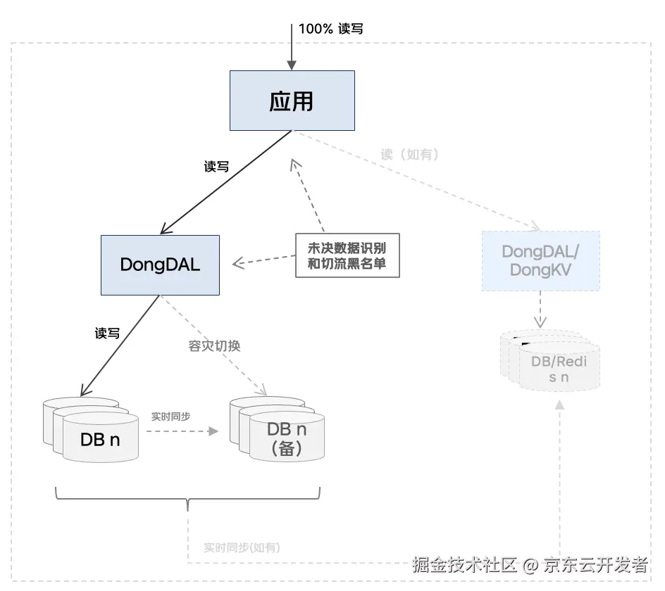 •强一致读写的状态数据,代表业务京豆、红包、优惠卷等,主要和资产业务相关,要求读写数据均强一致,采用分库分表+未决数据隔离。为来保证强一致读写需要用数据库承接读写请求,同时为主库设置容灾备库,主从切换时需要按黑名单切流避免出现脏写。