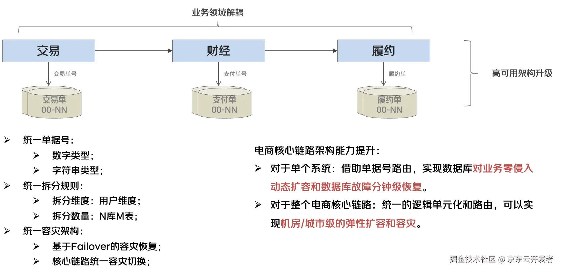 2025年京东电商核心链路的单据数据完成架构升级,通过升级单据号生成规则和基于单据号路由,统一了电商核心链路单据数据的拆分维度和拆分规则,实现电商核心链路单据弹性扩容和统一容灾。