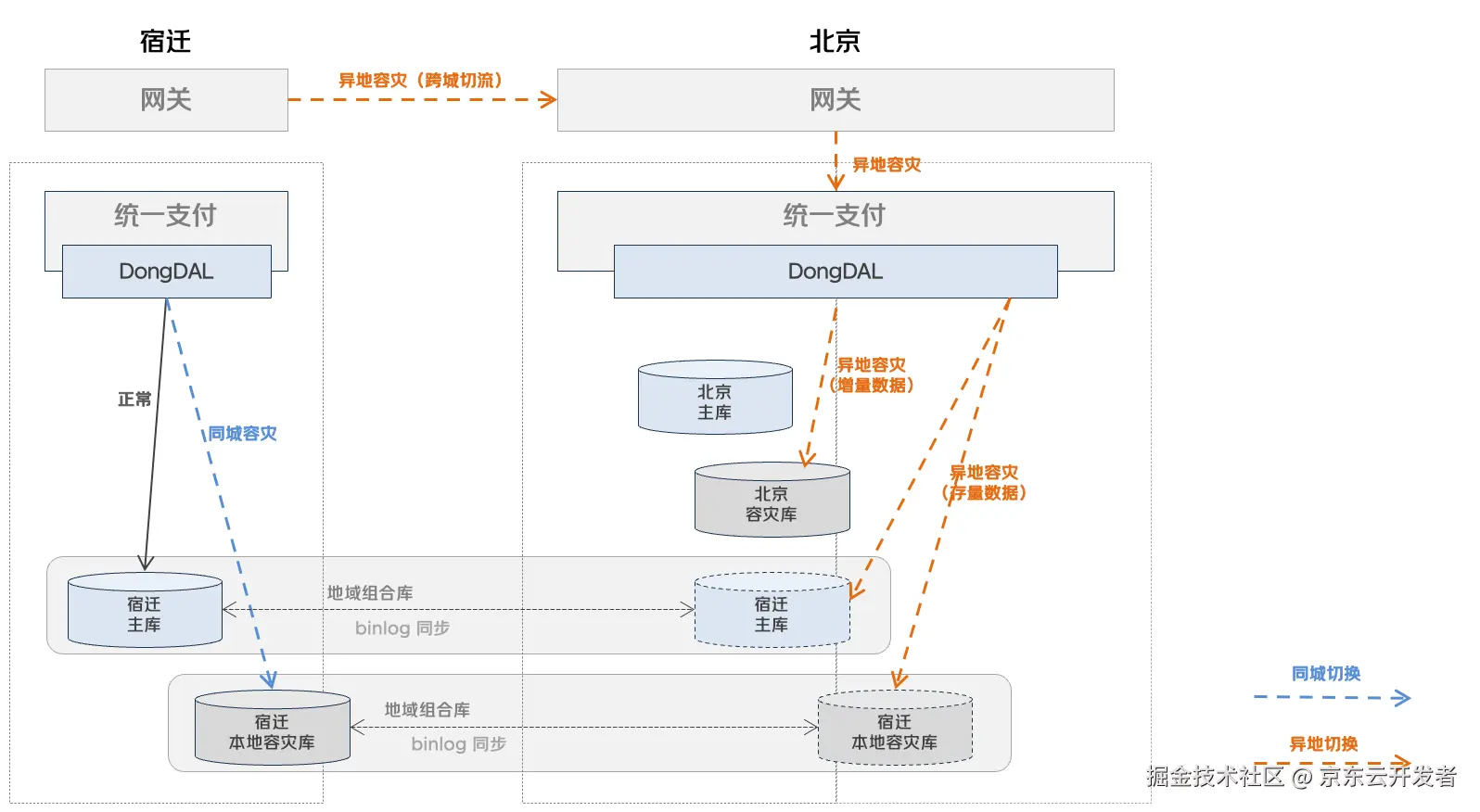 京东电商支付系统有金融属性,对高可用和数据一致性有比较高的要求。在京东的异地多活单元化架构下,为了支持统一支付系统北京宿迁多活部署和跨城切流的业务不停、数据不丢失的诉求,2025年用时一个月余,完成了流水数据同城和跨城切流机制的建设,为支付系统建设起同城和异地多活切高可用容灾部署架构。在同城和异地容灾下,RPO=0,RPO<10s,且基于新流水路由至全新库的机制,保障业务不停,数据不丢。