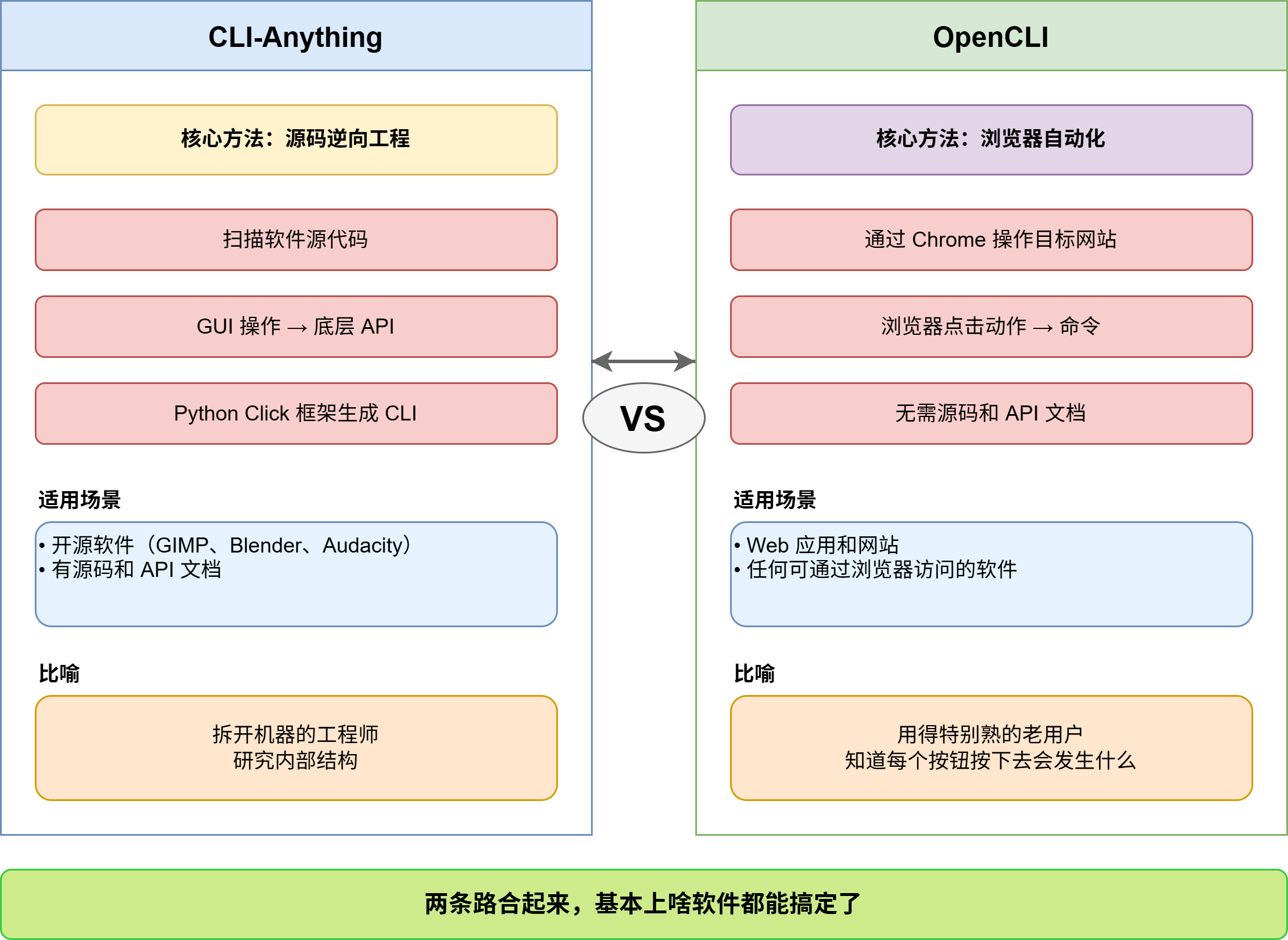 打个比方:CLI-Anything 像是拆开机器的工程师,研究内部结构。OpenCLI 更像是一个用得特别熟的老用户,机器外壳没动,但他知道每个按钮按下去会发生什么。