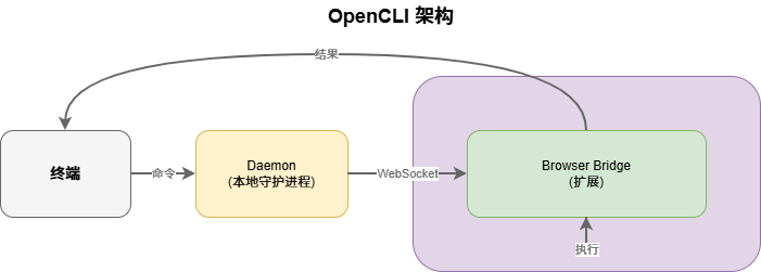 你在终端敲命令 → 本地 Daemon 接收 → WebSocket 传给 Chrome 扩展 → 扩展在浏览器里执行 → 结果返回终端