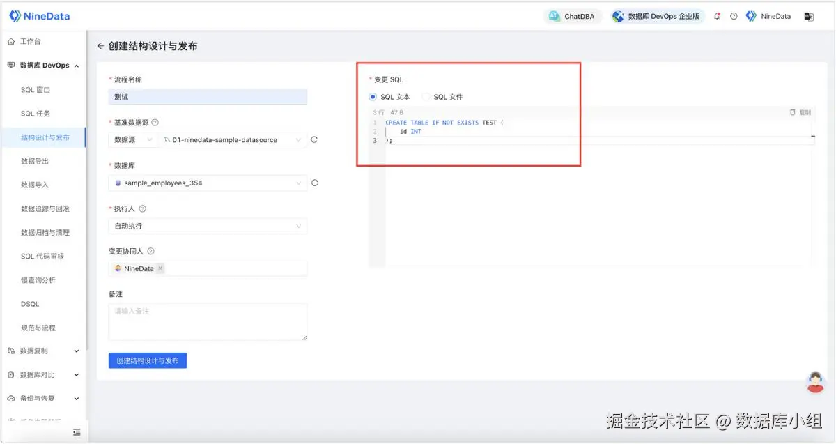 在变更 SQL 文本框中输入需要发布的变更语句。