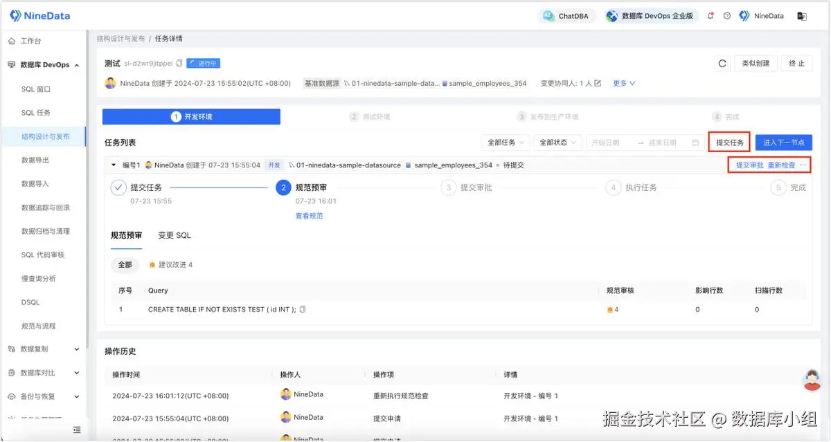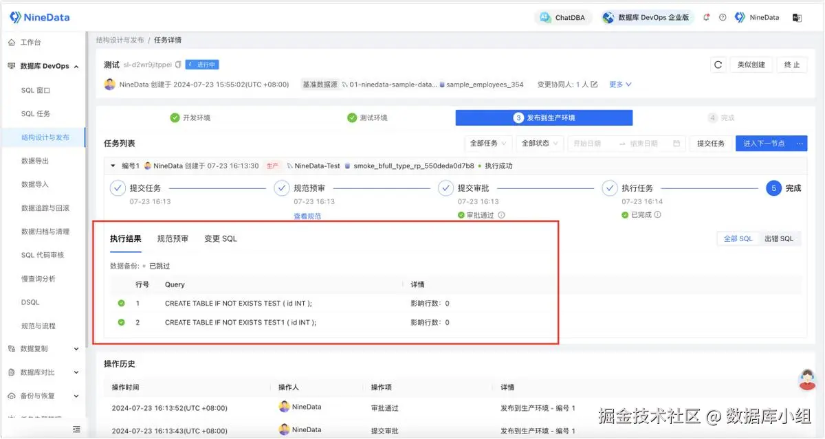 NineData 并不是要替代迁移工具的价值,而是补足它们在多环境结构发版场景中的能力边界。比如:脚本工具通常不会天然告诉你测试环境和预发环境是否只执行了前面成功验证过的脚本;也不会天然提供围绕数据库对象与环境的统一审批、规范、版本回看能力。这些不是 migration 文件本身能解决的问题。