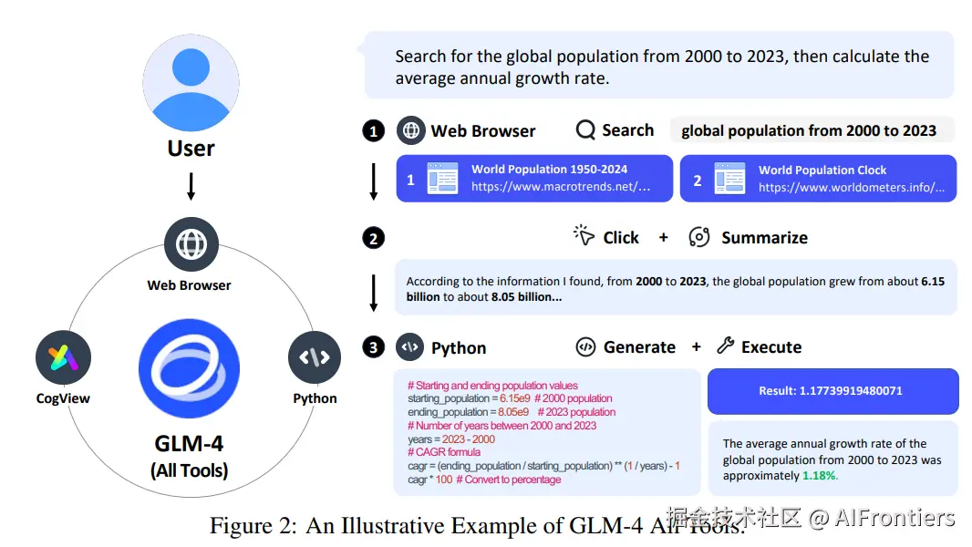 GLM-4移除了除QKV之外的所有偏置项,并扩大了FFN的参数规模。它在对齐上采用多阶段后训练过程,通过人类反馈强化学习(RLHF)实现了极高质量的指令遵循。其中GLM-4 All Tools版本被训练为能自主决定使用网页浏览器、Python解释器或生图模型来完成复杂任务。