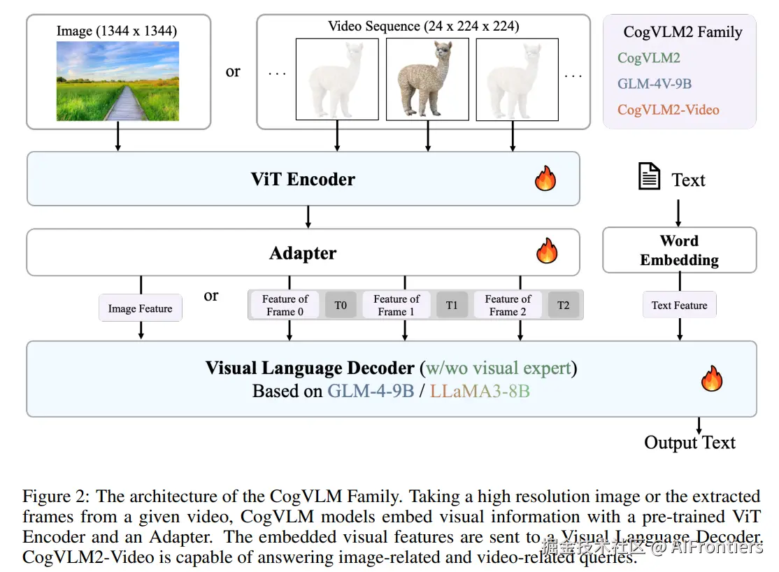 模型基于Meta-Llama-3-8B构建,支持8K上下文和1344x1344的高分辨率输入。其视频理解版本CogVLM2-Video通过提取关键帧,能处理长达1分钟的视频序列。