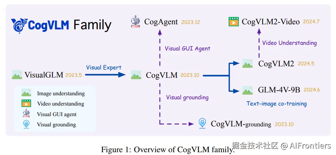| 2023/12/14 | CogAgent | 高分辨率视觉,GUI坐标精准操作,OCR能力强 |