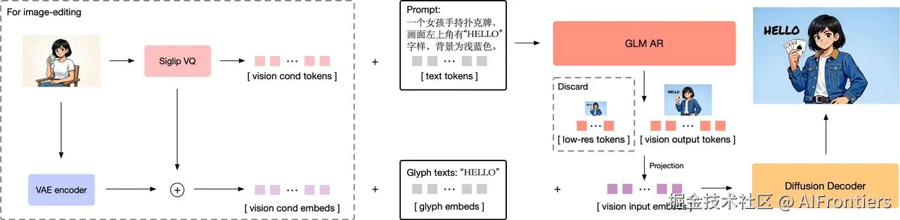 采用自回归 (9B) + 扩散 (7B)的解耦架构,将任务拆分为语义布局与细节填充。引入 Semantic-VQ 方案替代传统 VQVAE,使 AR 模块生成的低频 Token 语义更强,再由扩散解码器通过 Flow Matching 转化为高频细节。此外,集成 Glyph-ByT5 编码器,大幅强化了复杂中英文字符的渲染精度。
