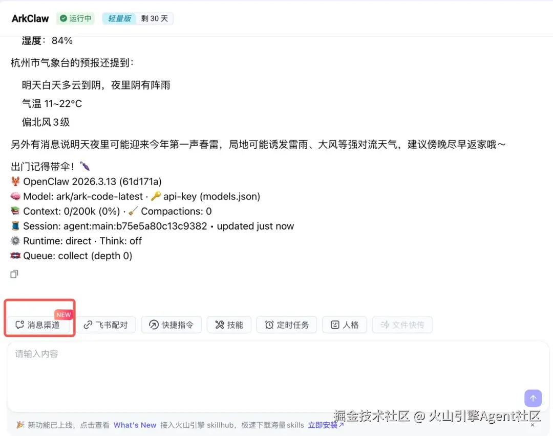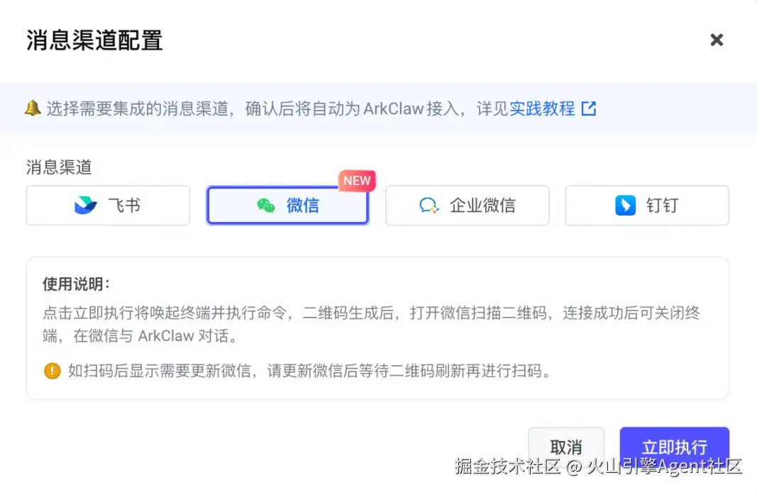 - 请登录火山引擎控制台 (历史在方舟体验中心订阅Coding Plan 赠送的 ArkClaw 需进入该产品入口链接体验新功能),选择 ArkClaw 配置消息渠道