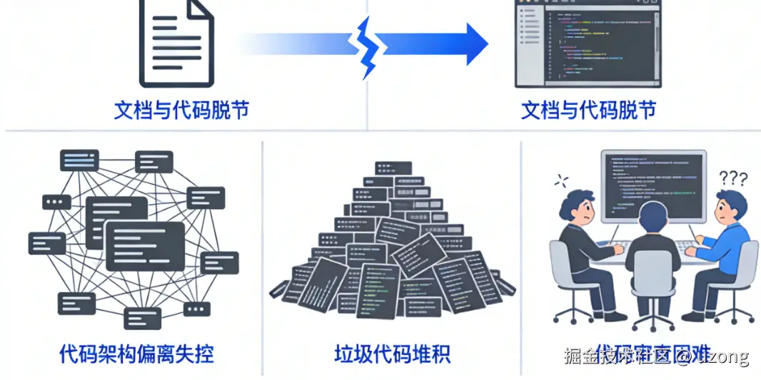 1. 文档与代码脱节,上下文跟不上或冗余,导致理解偏差,代码质量越来越差;甚至之前明确告知的禁忌,在后续沟通中仍被遗忘。