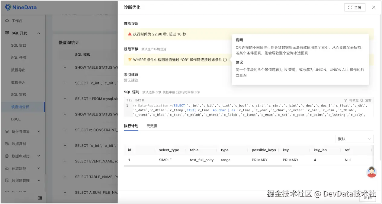 NineData诊断优化页:针对慢查询的 SQL 语句进行性能诊断,性能诊断的结果包含执行时间过长、有效读较低、等待时间占比偏高、缓存命中率低下等;规范审核基于管理员配置的 SQL 开发规范对 SQL 语句进行审核;索引建议基于 CBO 成本代价模型提供索引推荐,帮助 DBA 更高效地优化数据库性能。