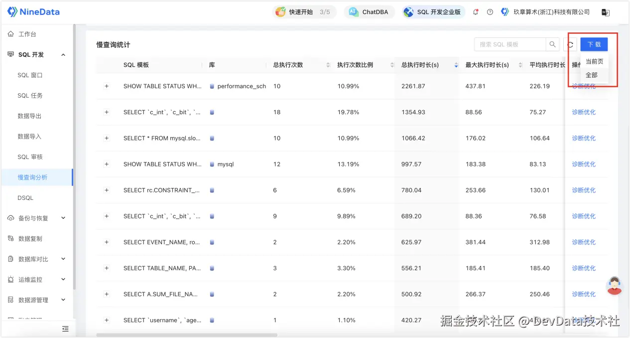 NineData慢查询报表下载:这个功能在我需要将优化需求提交给开发人员的时候比较实用,在数据源慢查询详情页中可将目标时间段的相关慢 SQL 整合到一个 PDF 文档中,其中包含了相关整改详情信息,以便开发人员对照优化。