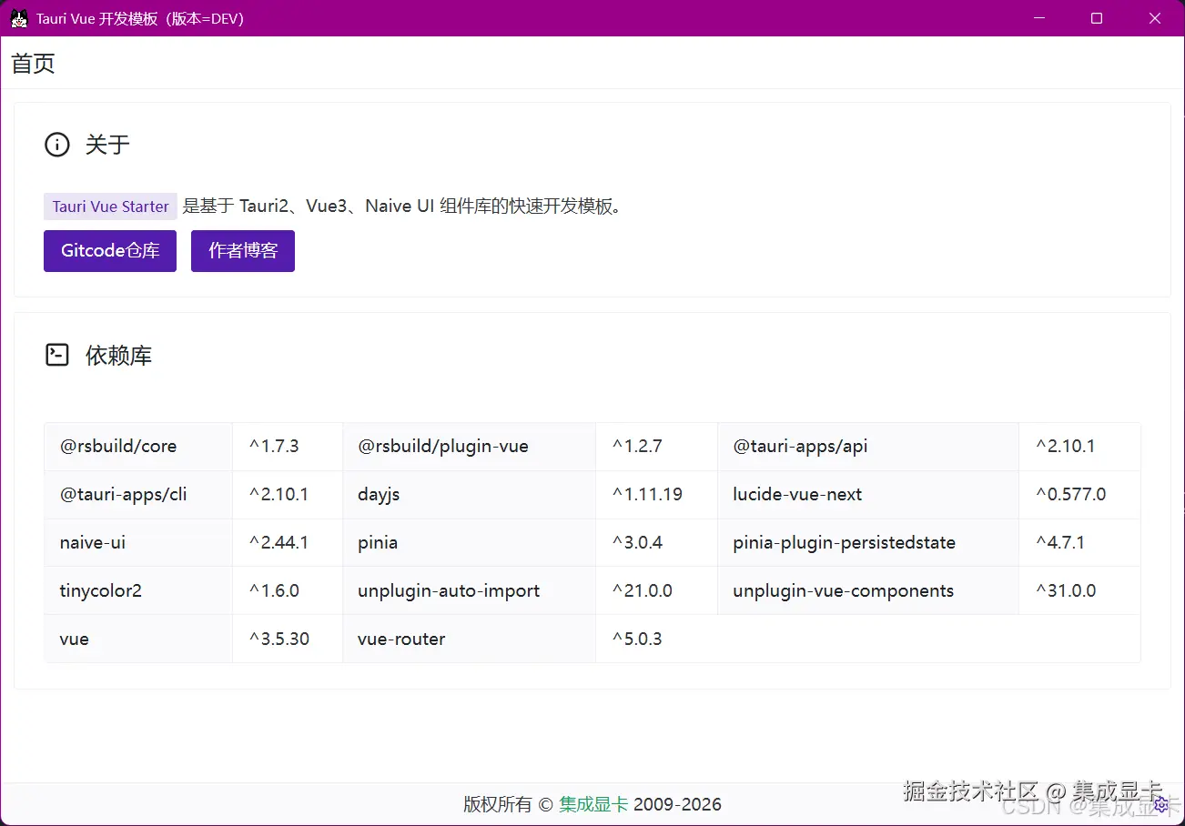 为了以后相似项目的开发,我开源了一个基于 Tauri2、Vue3、Naive UI(组件库)的快速开发模板:Gitcode、Github。