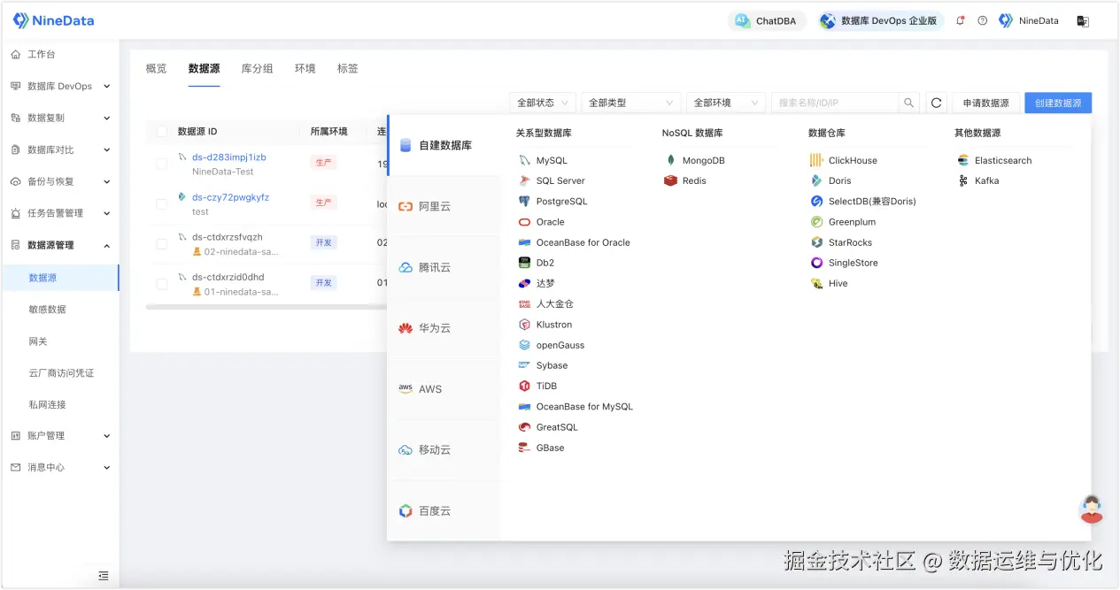 首先,你可以把企业的数据源都录入到 NineData 平台,一站式管理您的各类数据源,无需再使用多款零散的数据库管理工具,比如客户端、命令行工具等。NineData 提供统一的界面和操作方式,让你能够统一管理不同类型的数据源,无论是关系型数据库、NoSQL 数据库还是数据仓库。