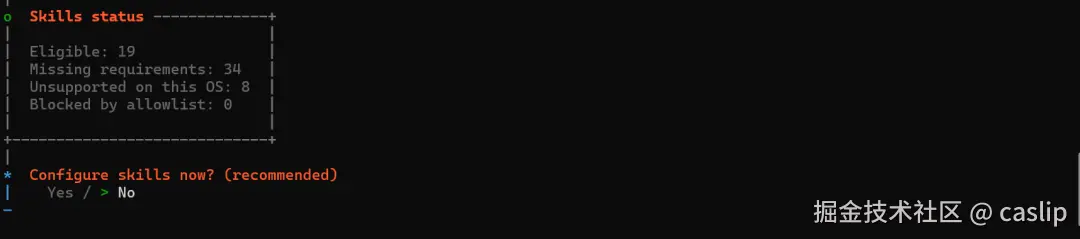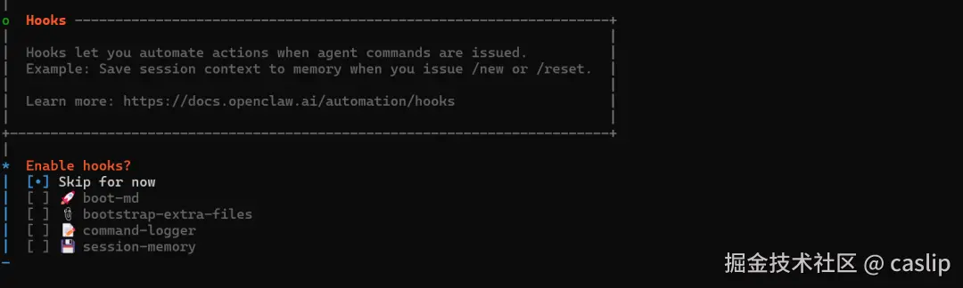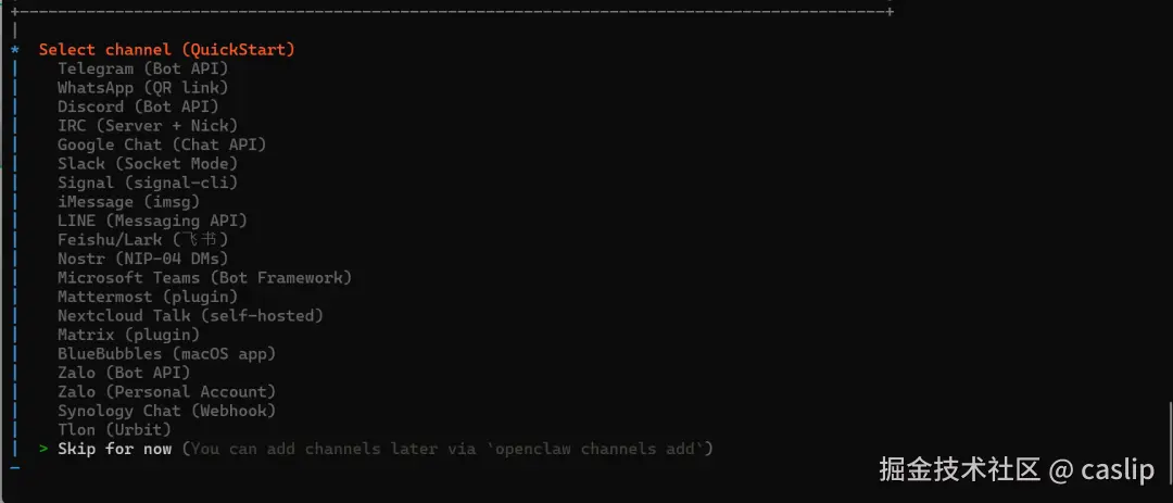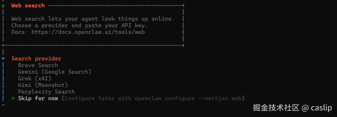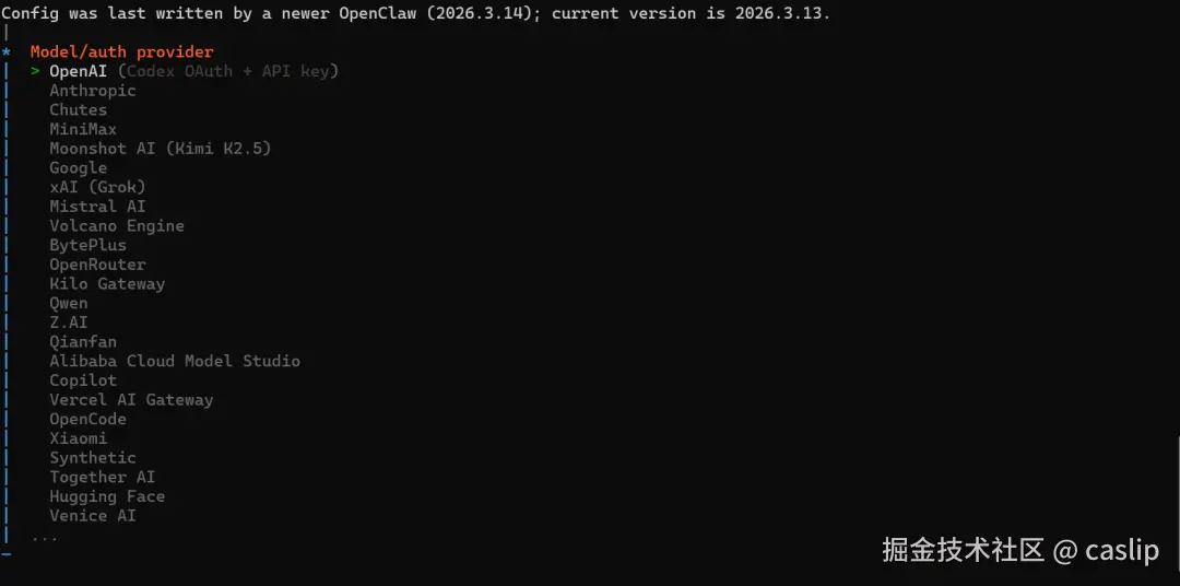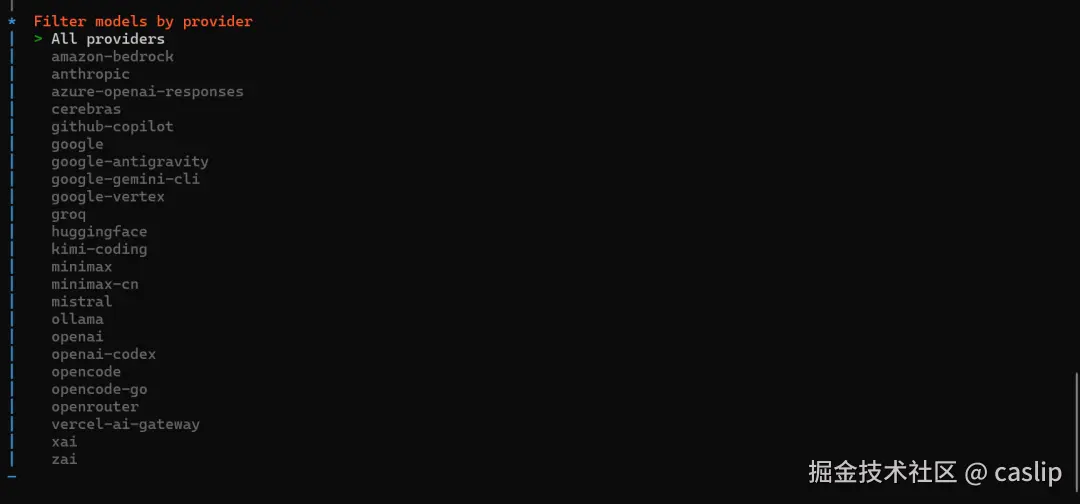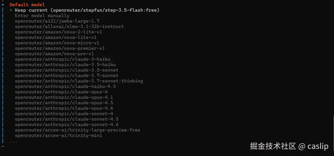 这一步选择模型供应商,我们使用Openrouter中转站,在这里没有,输入↑,skip for now