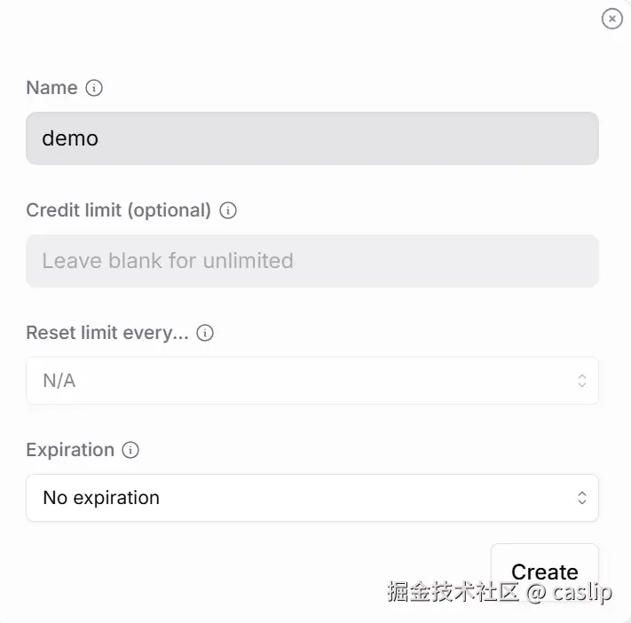 非纯小白可以自己找一下,纯小白直接点击这个链接,创建API key之前可能要先注册账号,注册完毕后点击Create,弹窗如下: