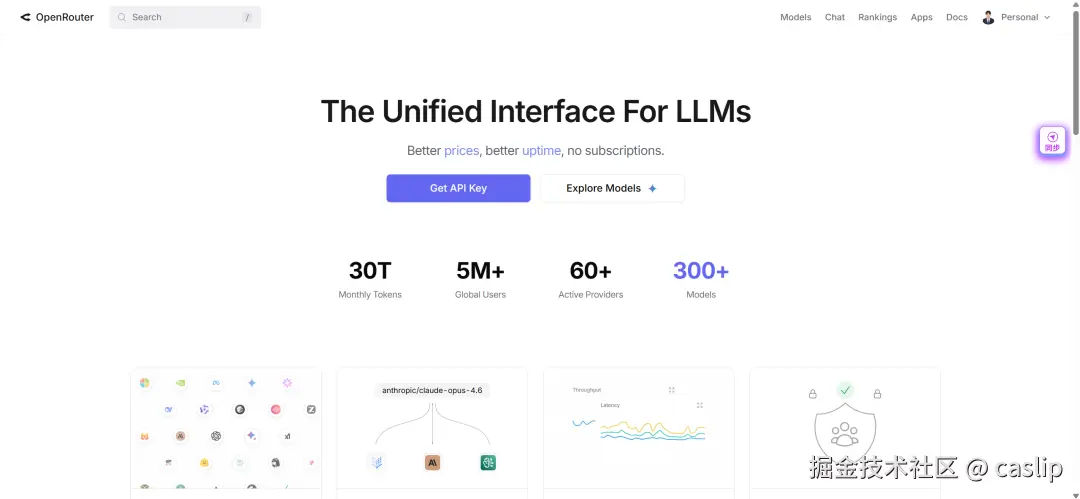 - 配置Openrouter免费模型。找到openrouter官网,地址为 openrouter.ai/ ,主页如下: