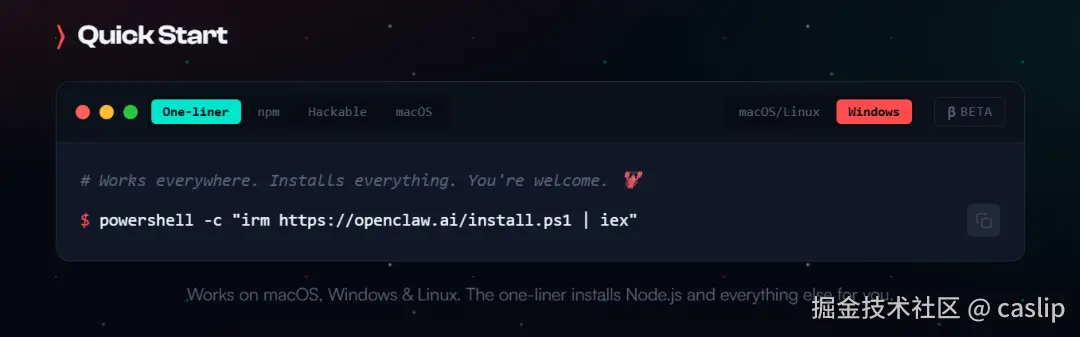 本文讲的适合小白的方法是打开openclaw官网 openclaw.ai/,根据自己的电脑系统执…