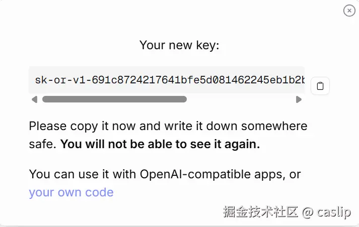 点击Create,复制API key,这个API key关闭此界面后就再也找不到了!!虽然创建一个新的也很方便,小白来说一定要保存下来,不然怕你一会儿复制别的东西覆盖掉了。可以发送给文件传输助手。