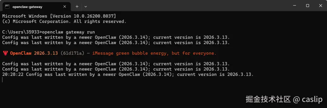 2. 安装完成后,使用Win+R,输入cmd打开命令行,输入以下命令:openclaw gateway run,执行结果如下图所示: