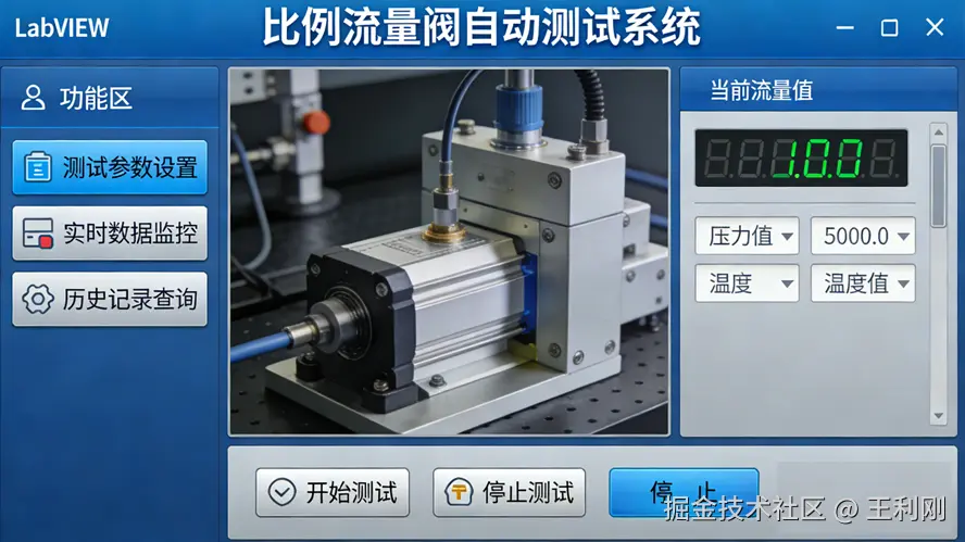 比例流量阀作为液压系统中流量精确控制的核心元件,其性能测试对系统压力稳定性、数据采集精度及控制响应速度均有严苛要求。基于 LabVIEW 构建的自动测试系统,通过软硬件协同设计,实现了流量阀性能参数的精准测量与压力回路的稳定控制。系统整体采用 “上位机 - 下位机 - 执行机构” 三层架构,上位机以 LabVIEW 为核心,负责数据采集、处理、分析及控制指令生成;下位机采用 PLC 实现现场设备的实时控制;执行机构包括伺服电机、比例阀组、传感器等,完成液压回路的动力输出与信号感知。