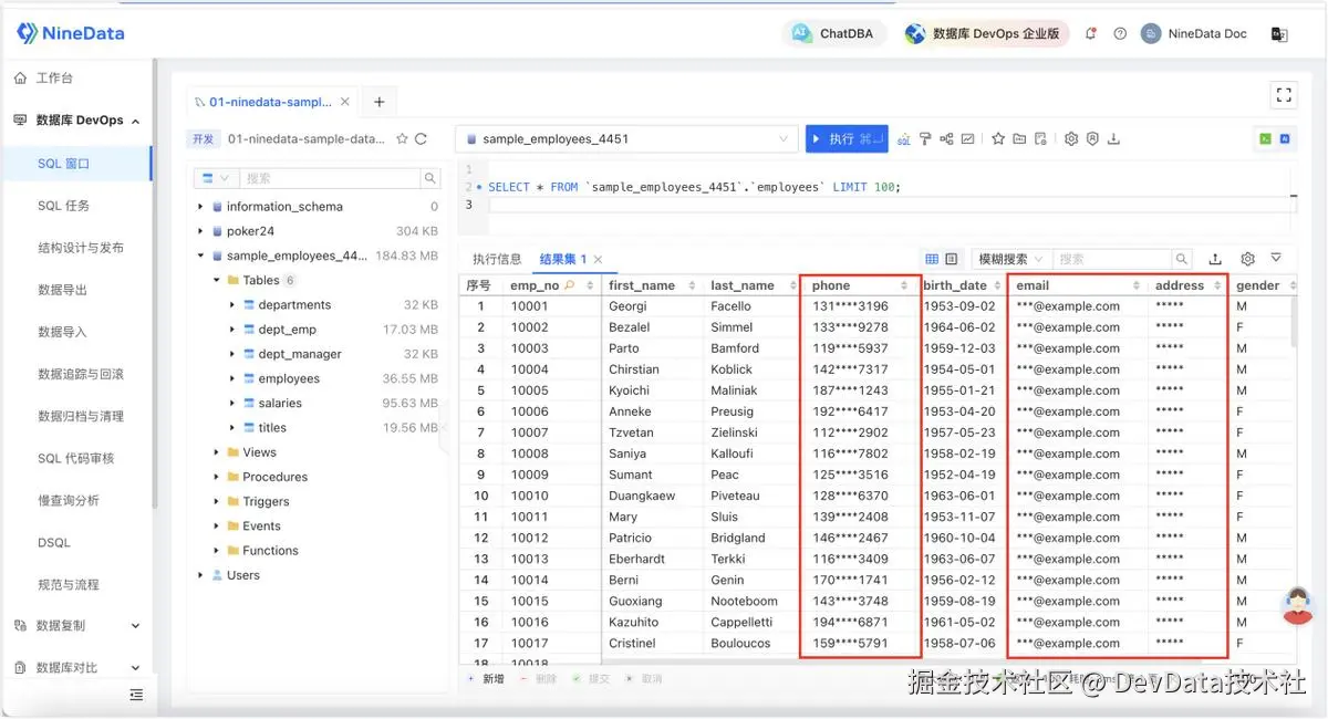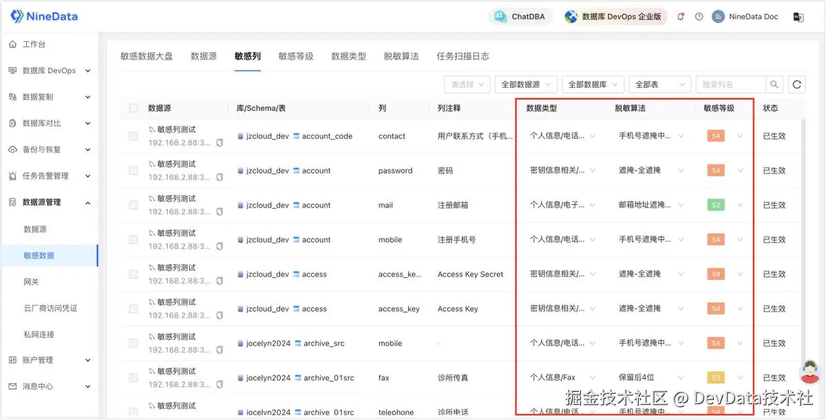 NineData 的敏感数据能力设计,更贴近这个问题本身。敏感列、敏感等级、敏感数据类型和脱敏算法的组合,让它更容易在“这个字段是什么、该被看成什么样”这一层持续沉淀规则。对于需要频繁处理手机号、身份证号、邮箱、地址等个人信息的分析型查询场景来说,这种围绕字段治理的思路更具针对性。