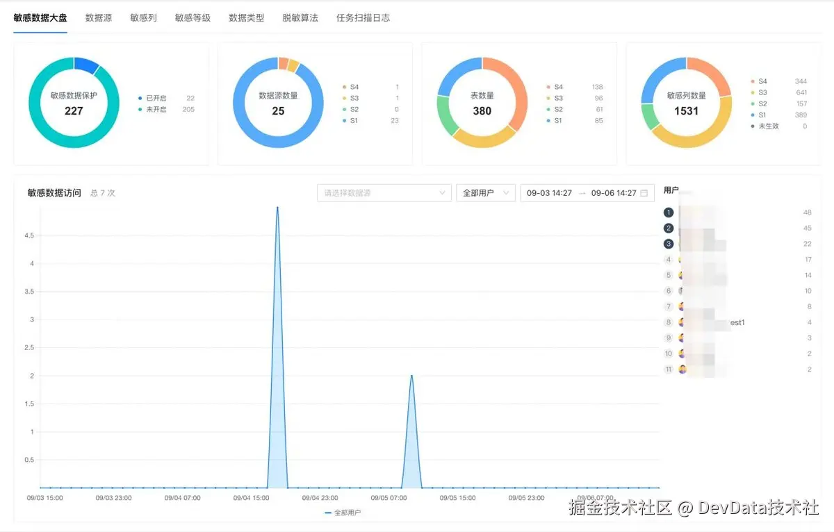 此外,NineData 提供的敏感数据大盘功能,展示当前组织下敏感数据相关信息,包含支持敏感数据保护的数据源总数、已开启敏感数据的数据源总数以及敏感级别、已开启敏感数据的表的总数、敏感列的总数、敏感数据访问次数等,管理员可以清晰了解企业数据库中敏感数据的整体情况。
