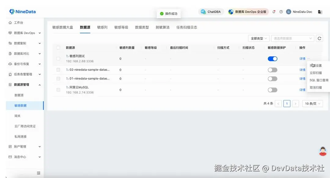NineData 支持对数据源中的列进行敏感列管理,既可以手动添加,也可以通过规则自动识别;打开目标数据源的敏感数据保护开关,单击操作列的扫描设置,点确定,如果表中存在敏感数据,只消等待片刻即可自动完成敏感列的添加。