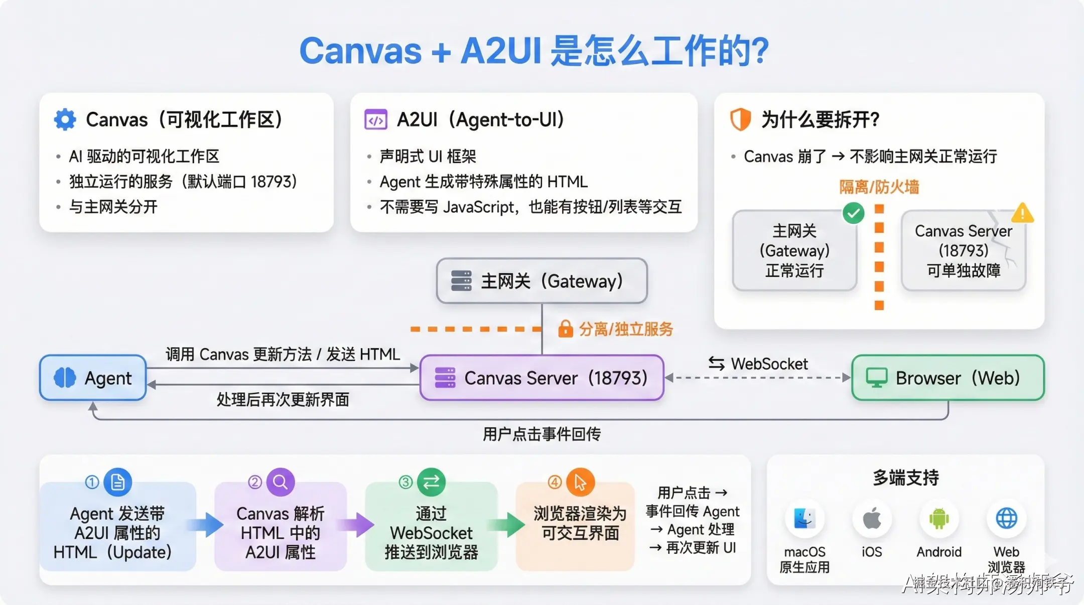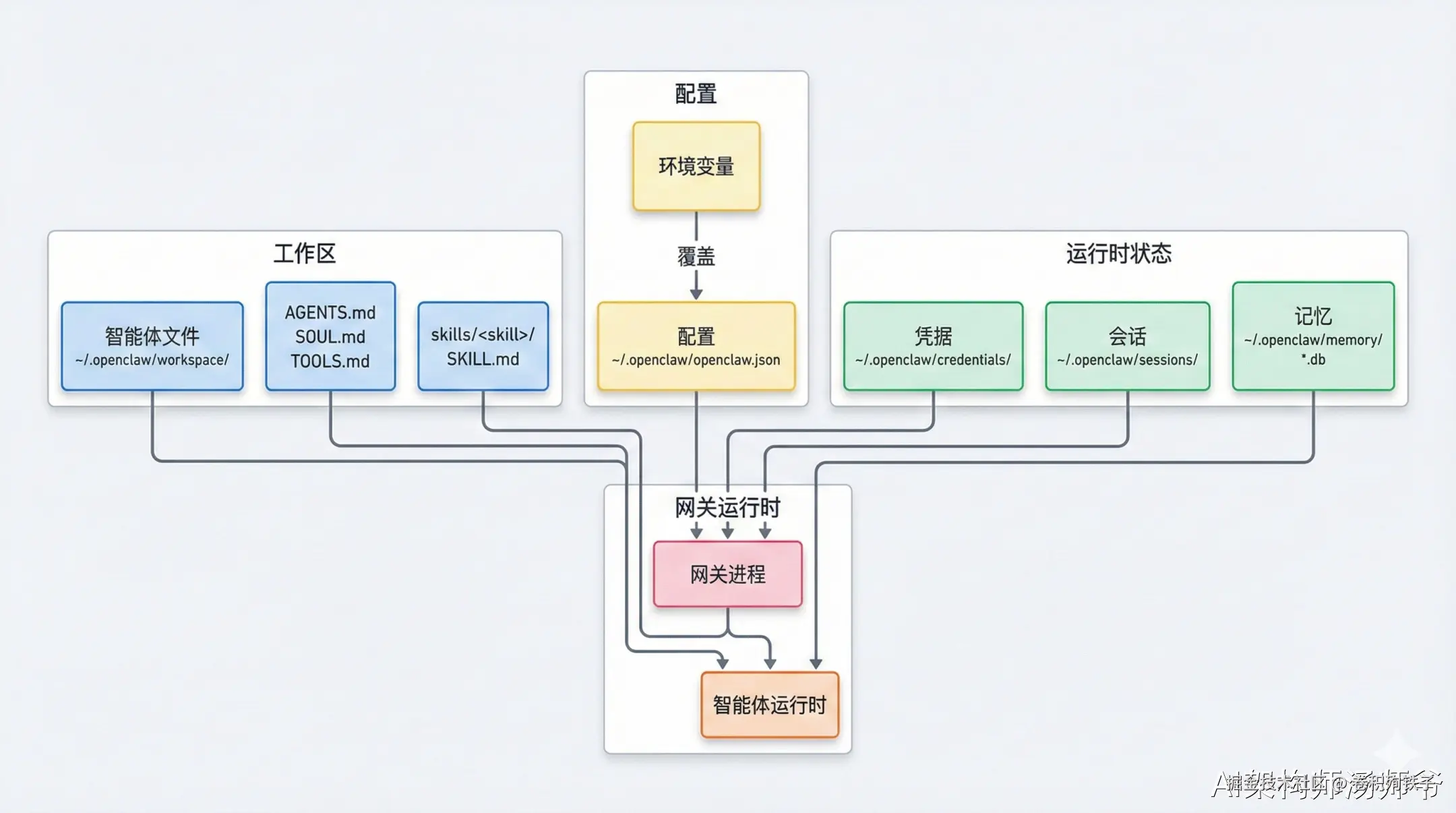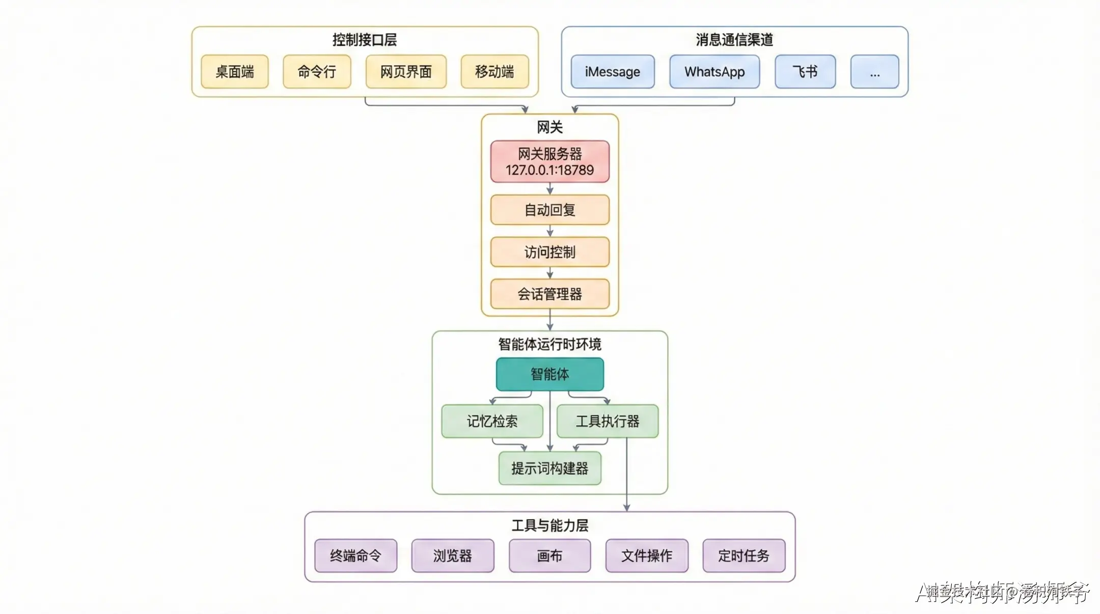 - 网关(Gateway):一个 WebSocket 服务器,连接各种聊天平台和控制界面,把收到的消息派发给 Agent 运行时处理。