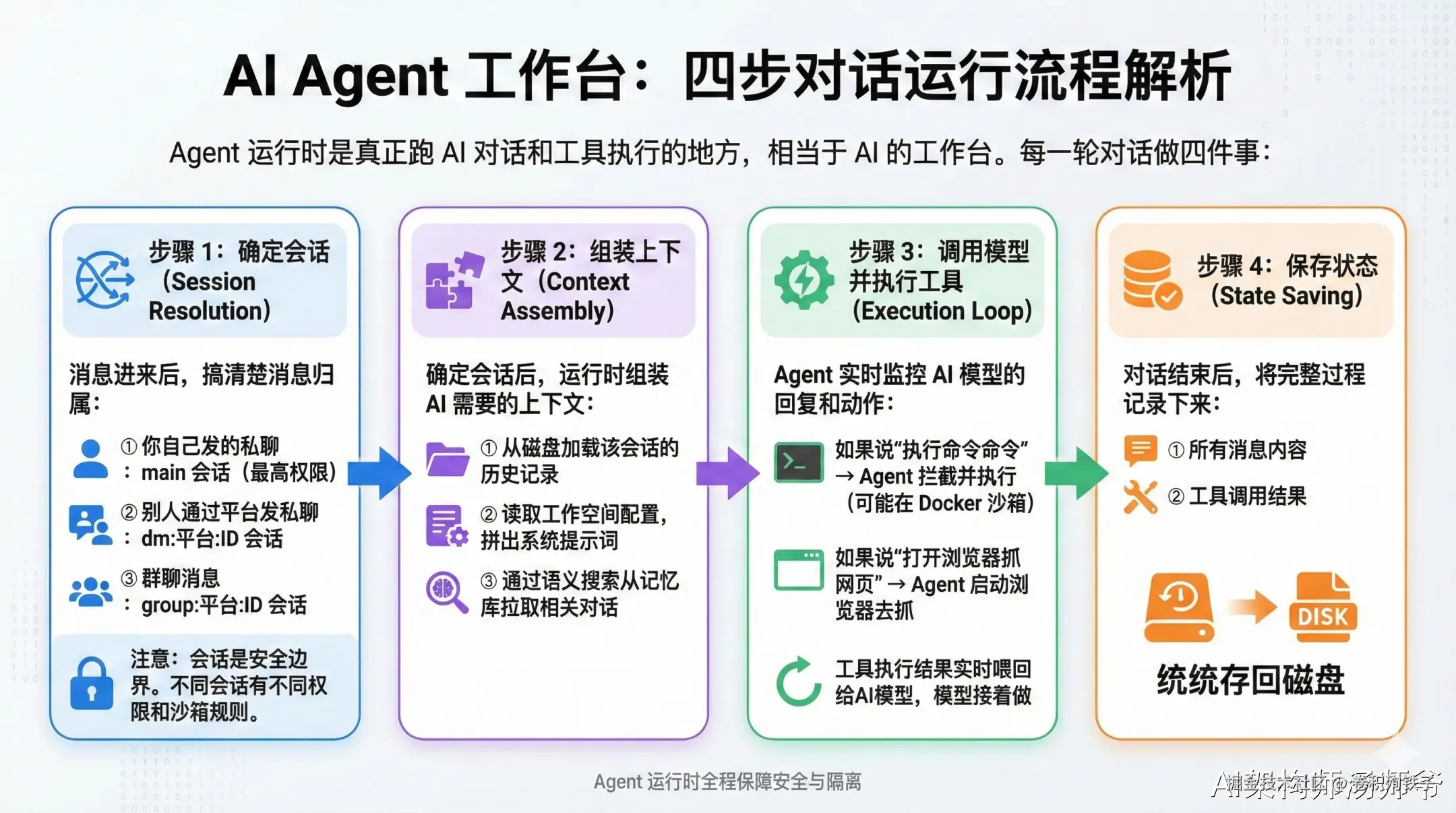 Agent 运行时每一轮对话做四件事: